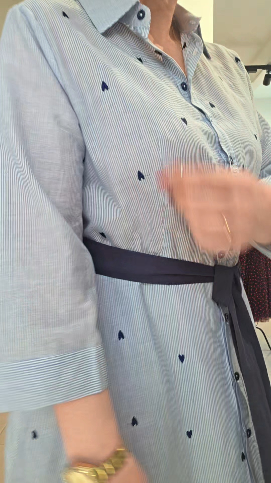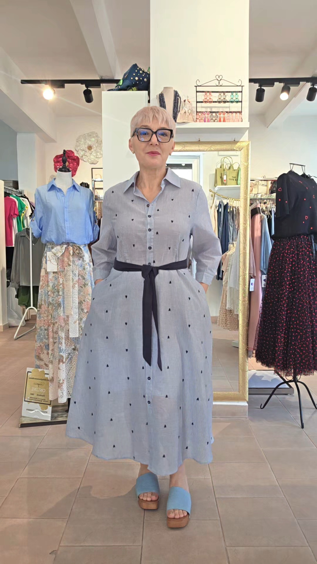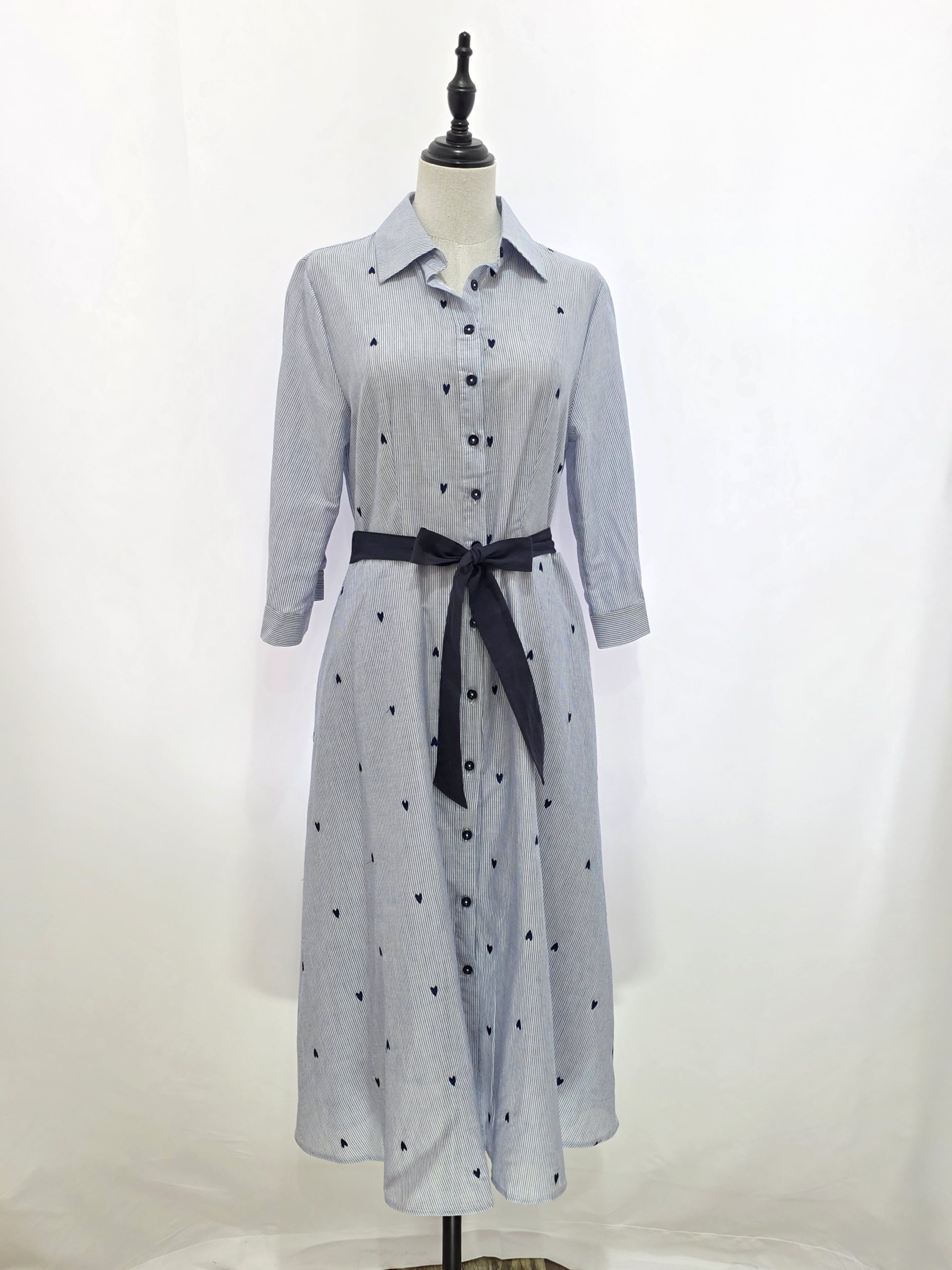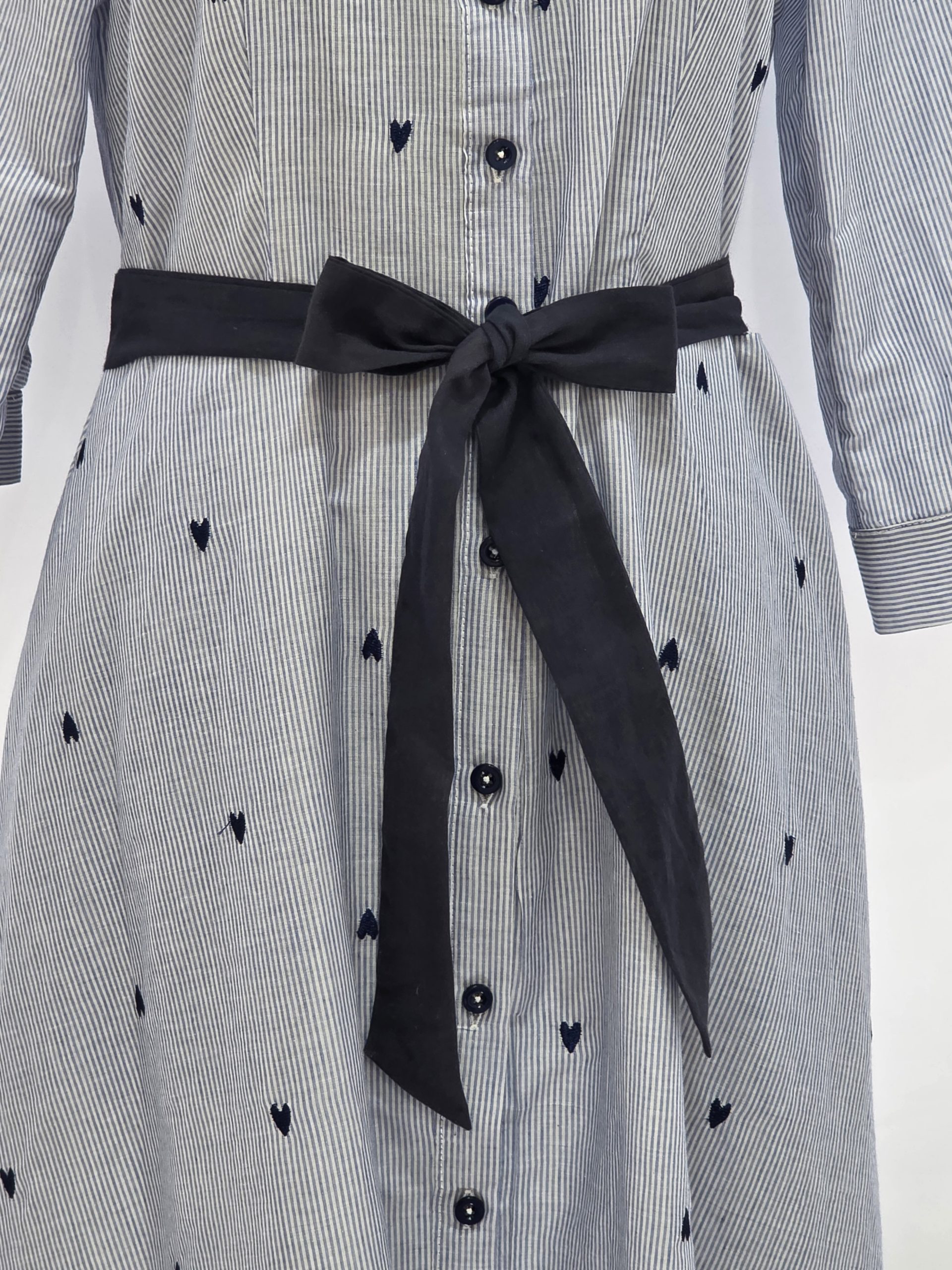 Abito chemisier gessato con cuori ricamati, cinturino in tessuto e tasche