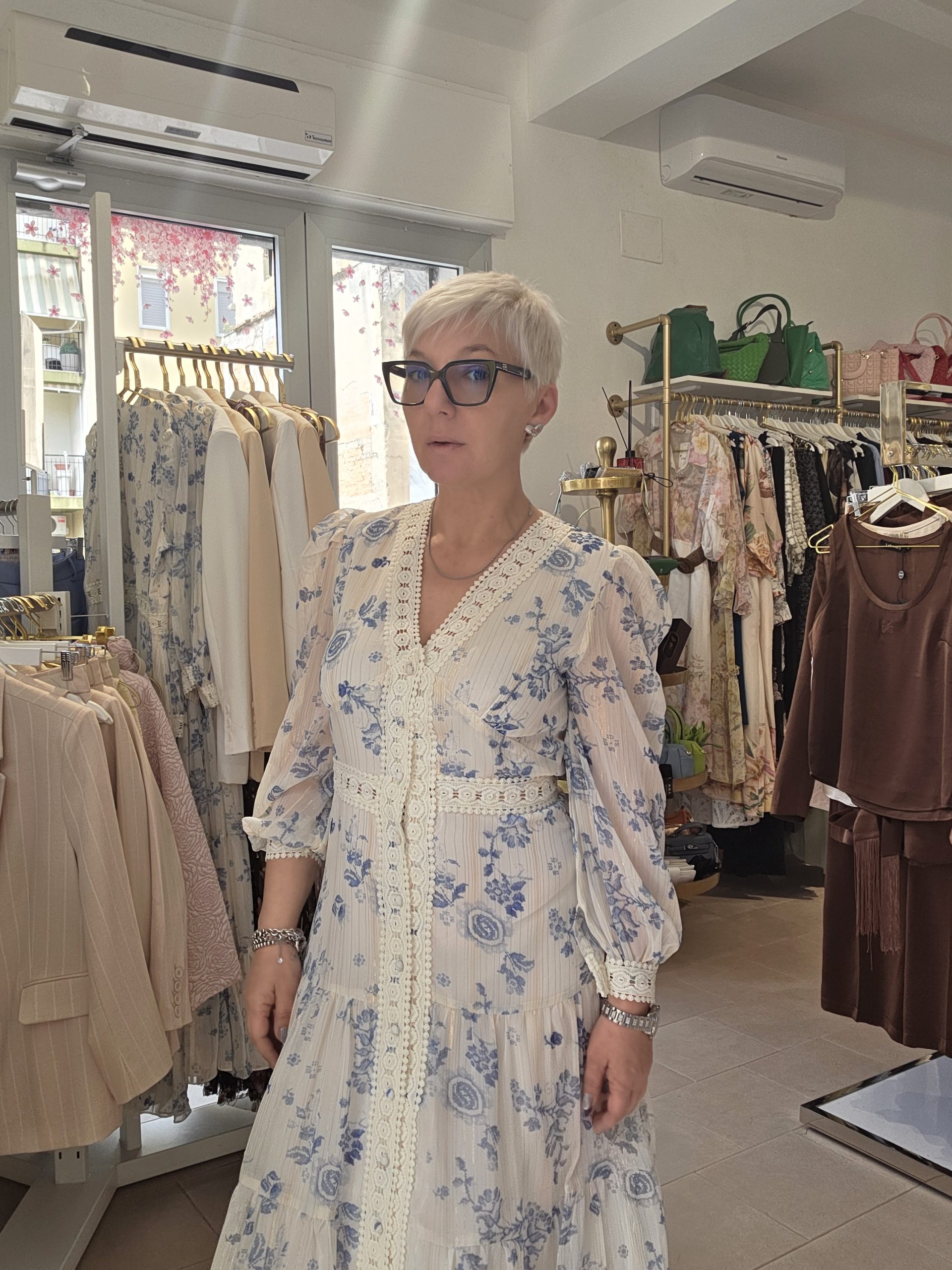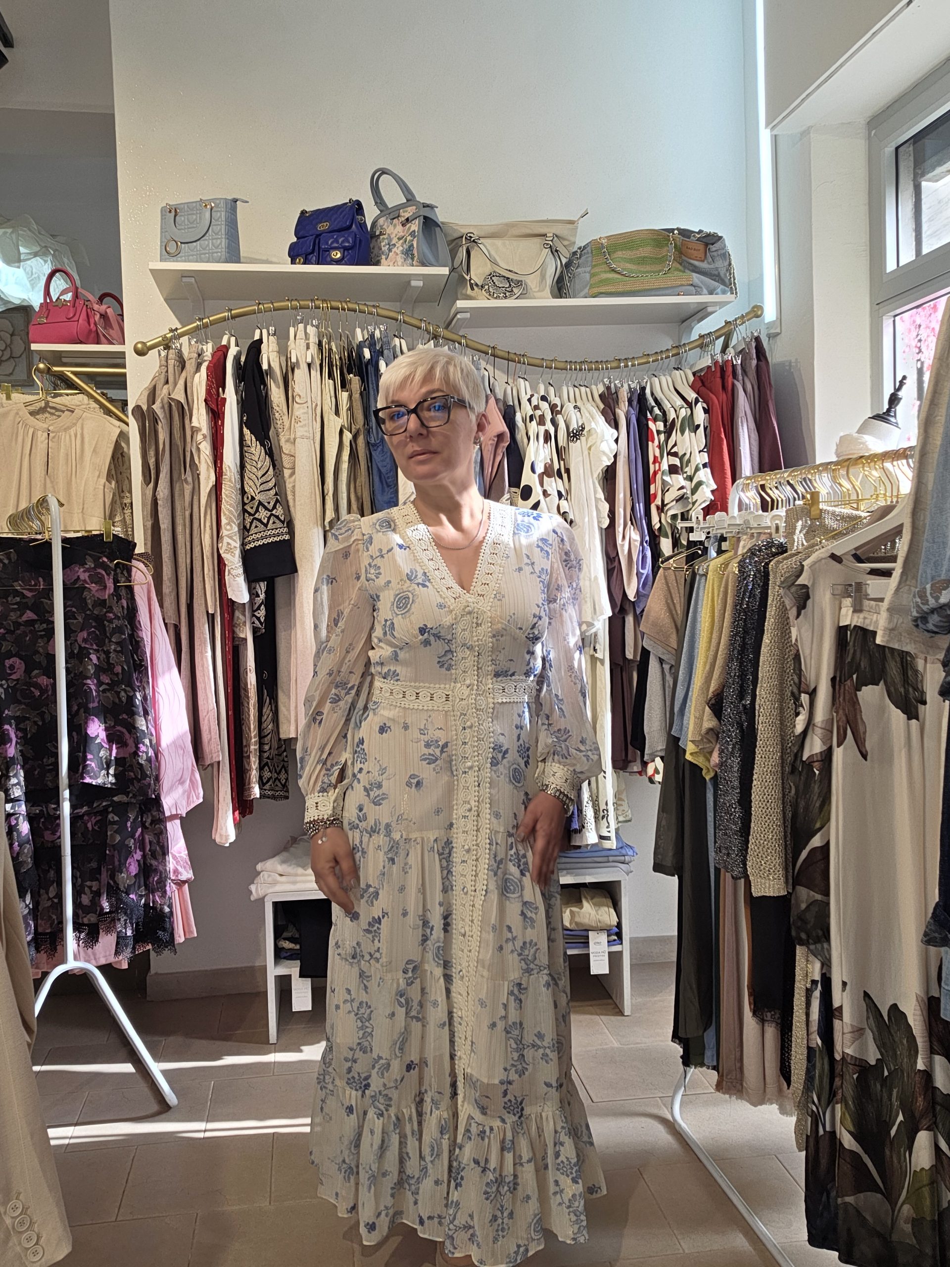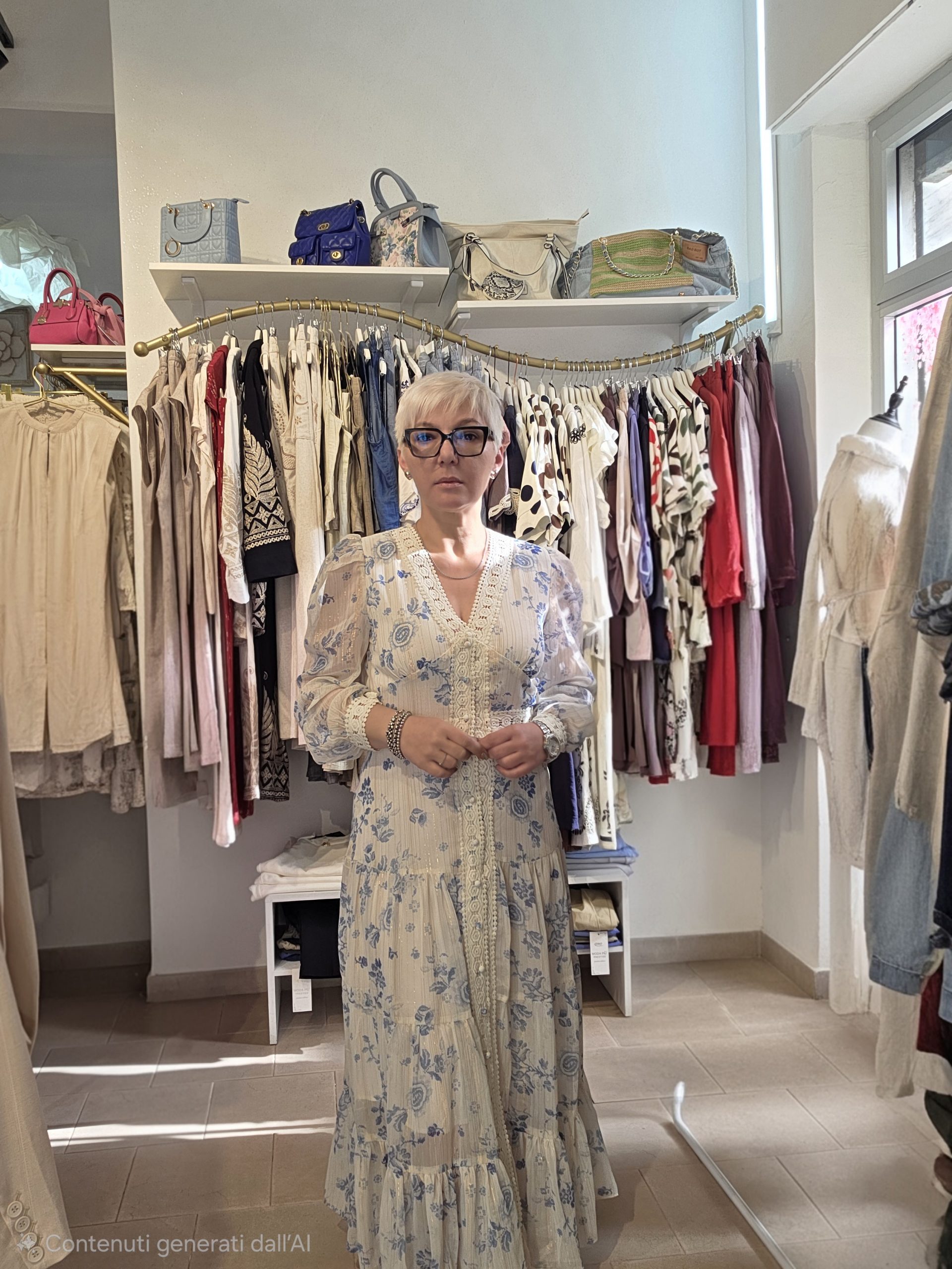 Abito lungo con collo a V, maniche lunghe e bottoni sul davanti, effetto volant e macramè