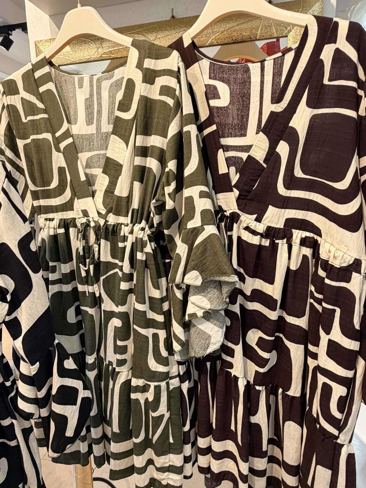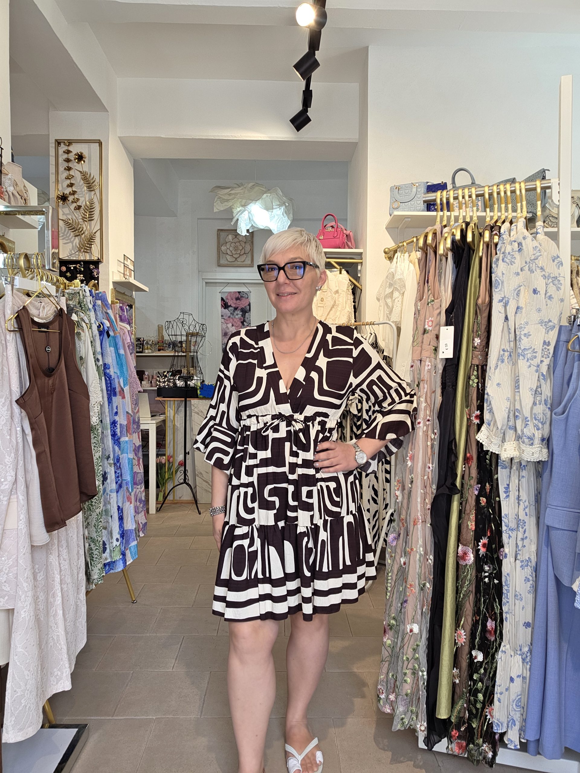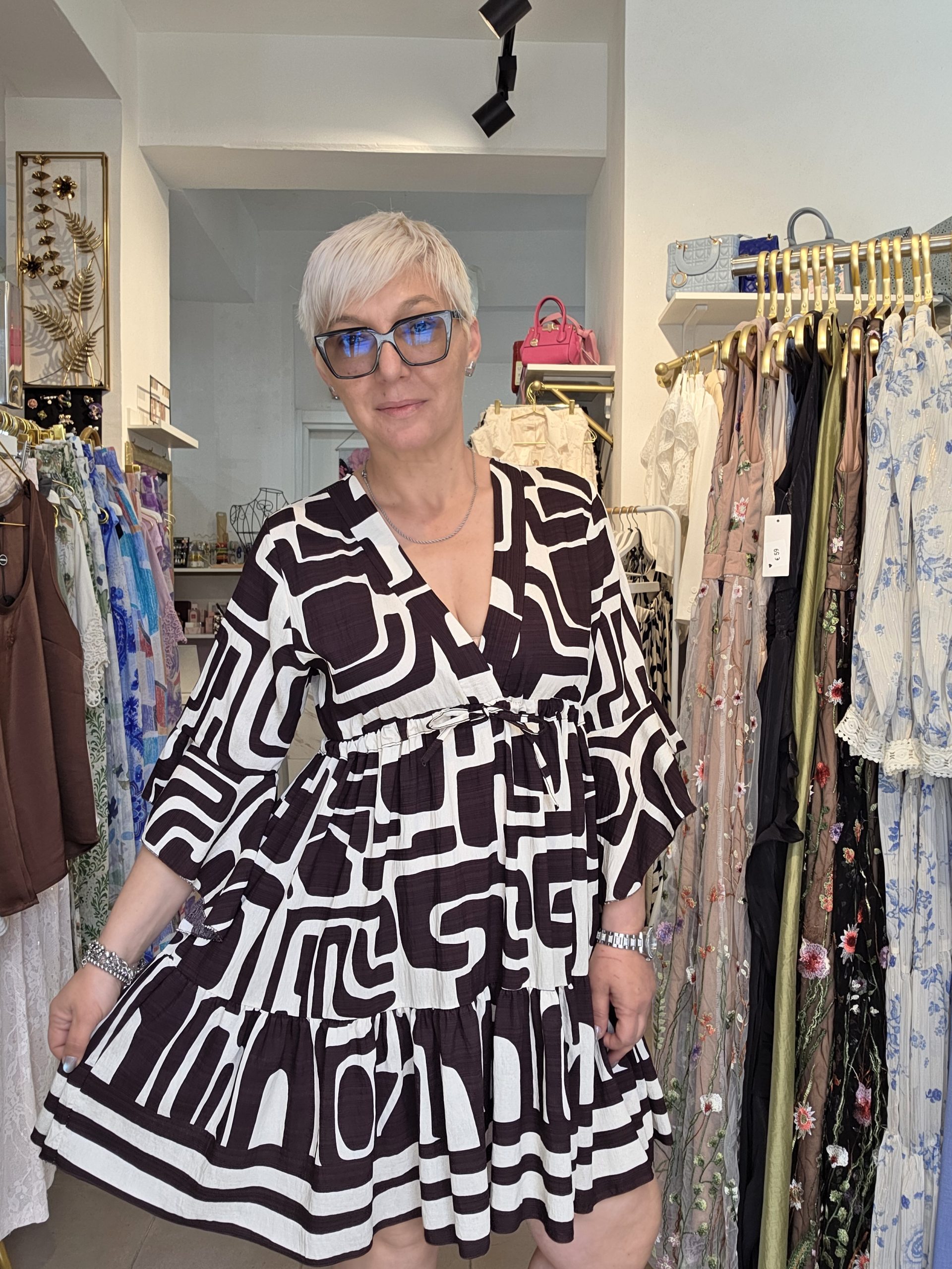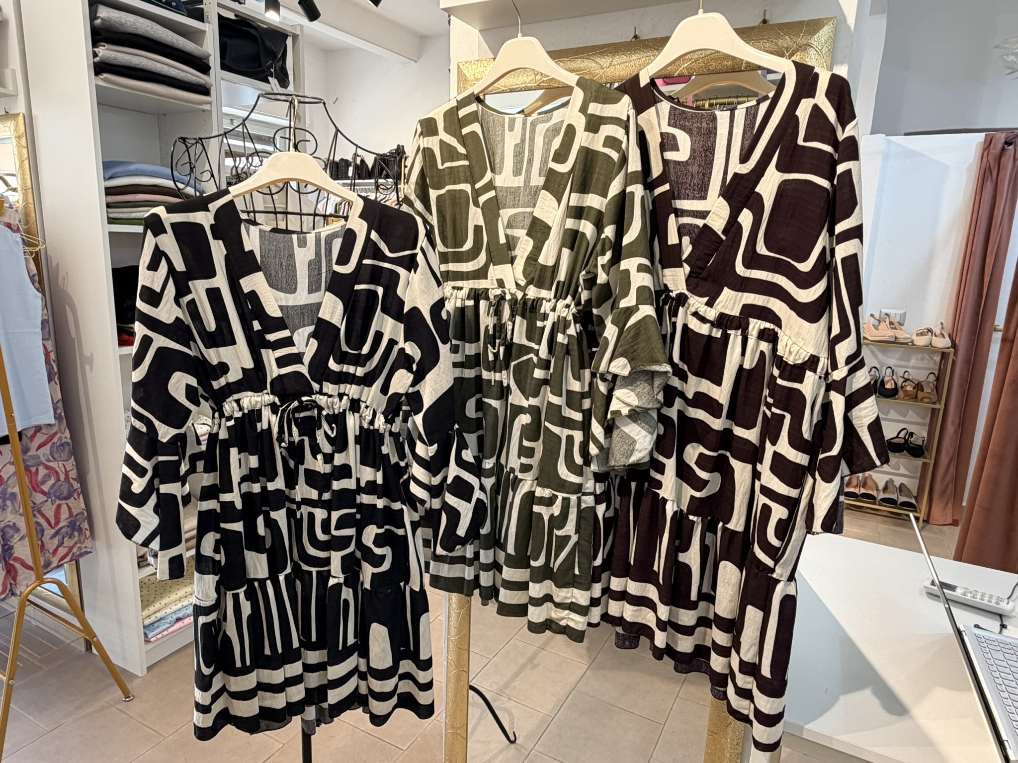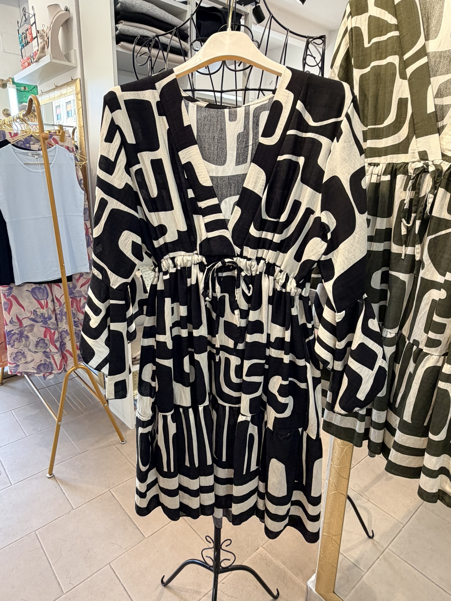Abito in cotone corto e svasato in fantasia optical, con scollo a V e laccetto nel punto vita, vestibilità dalla S alla XL