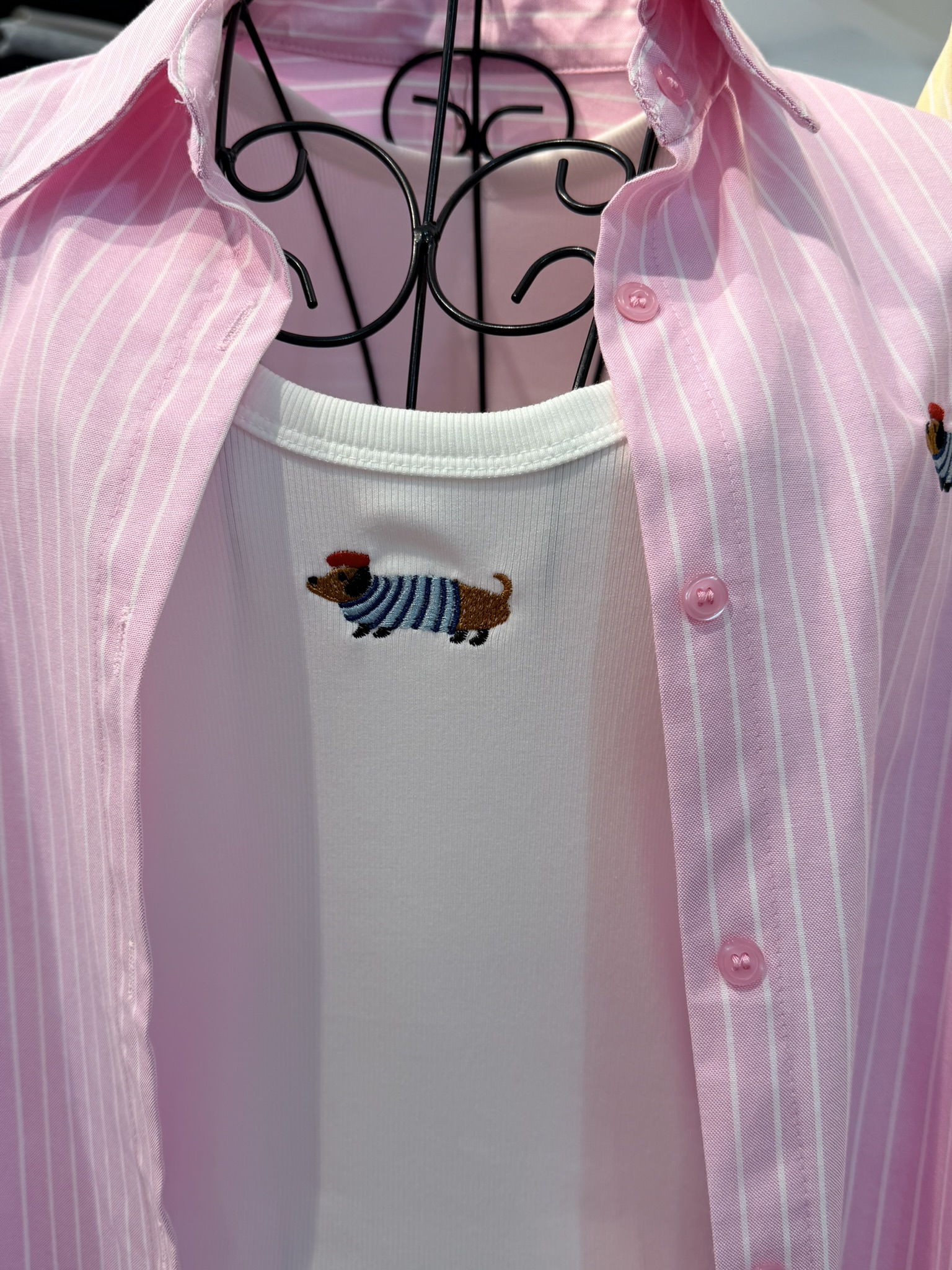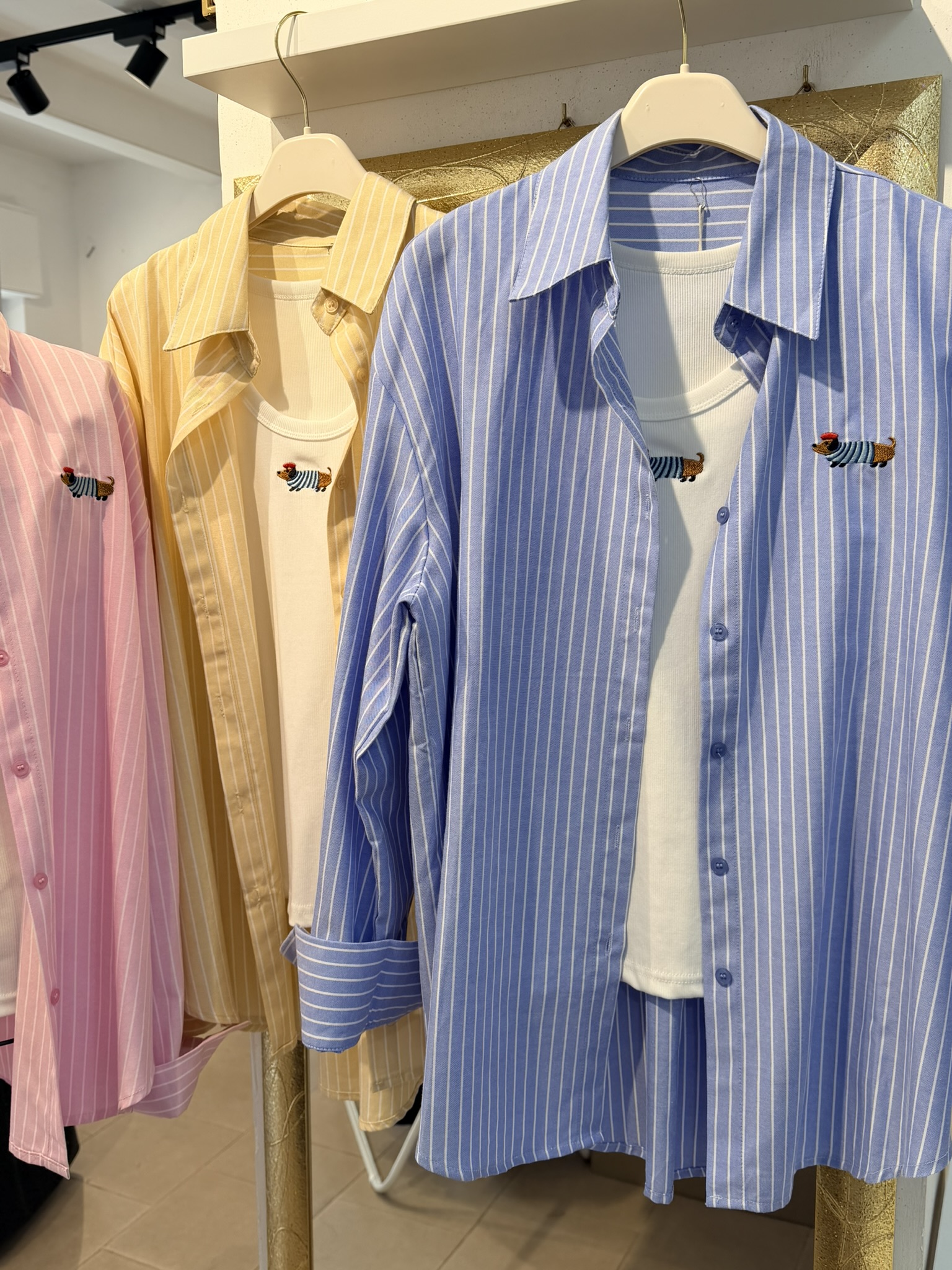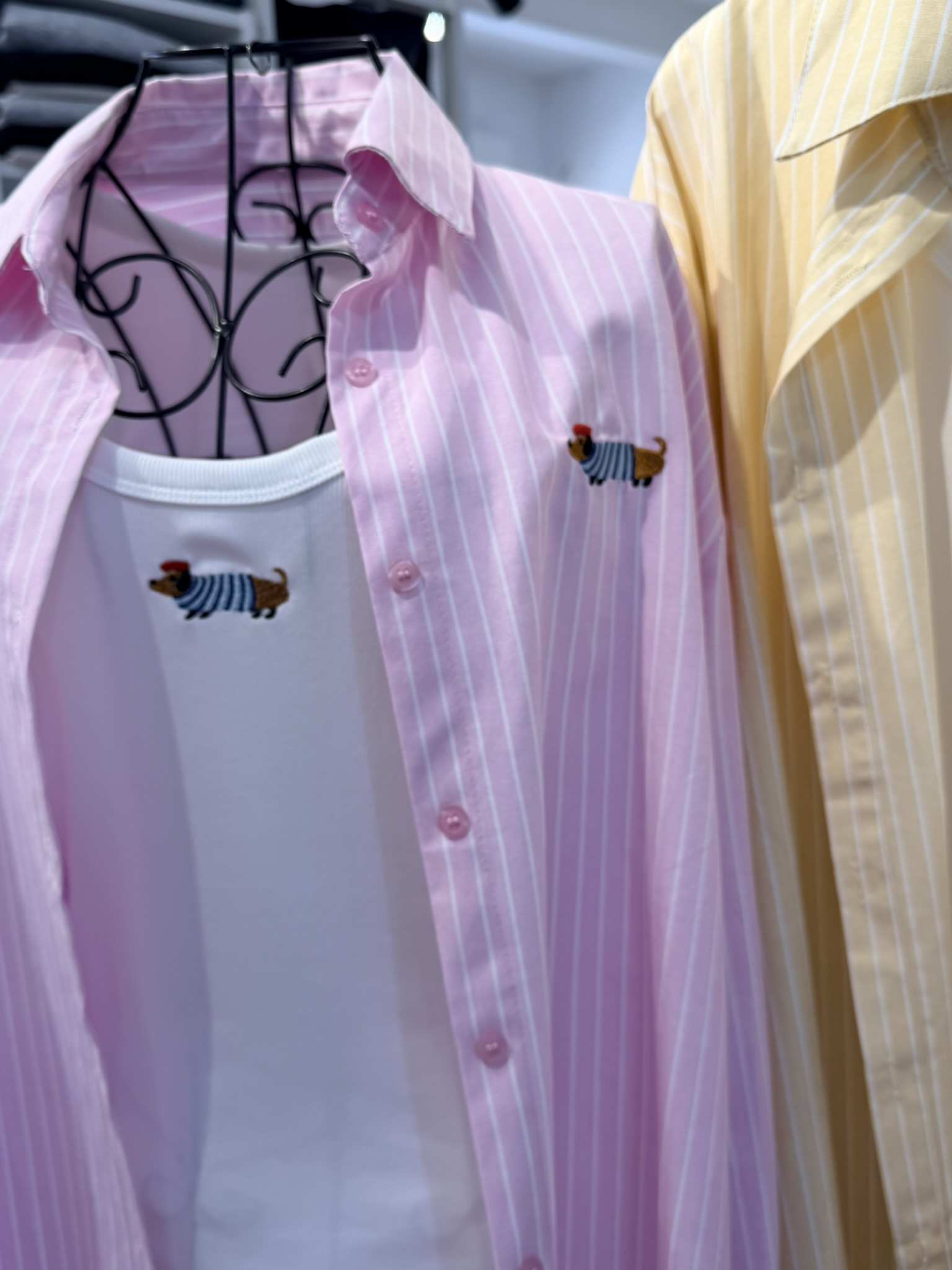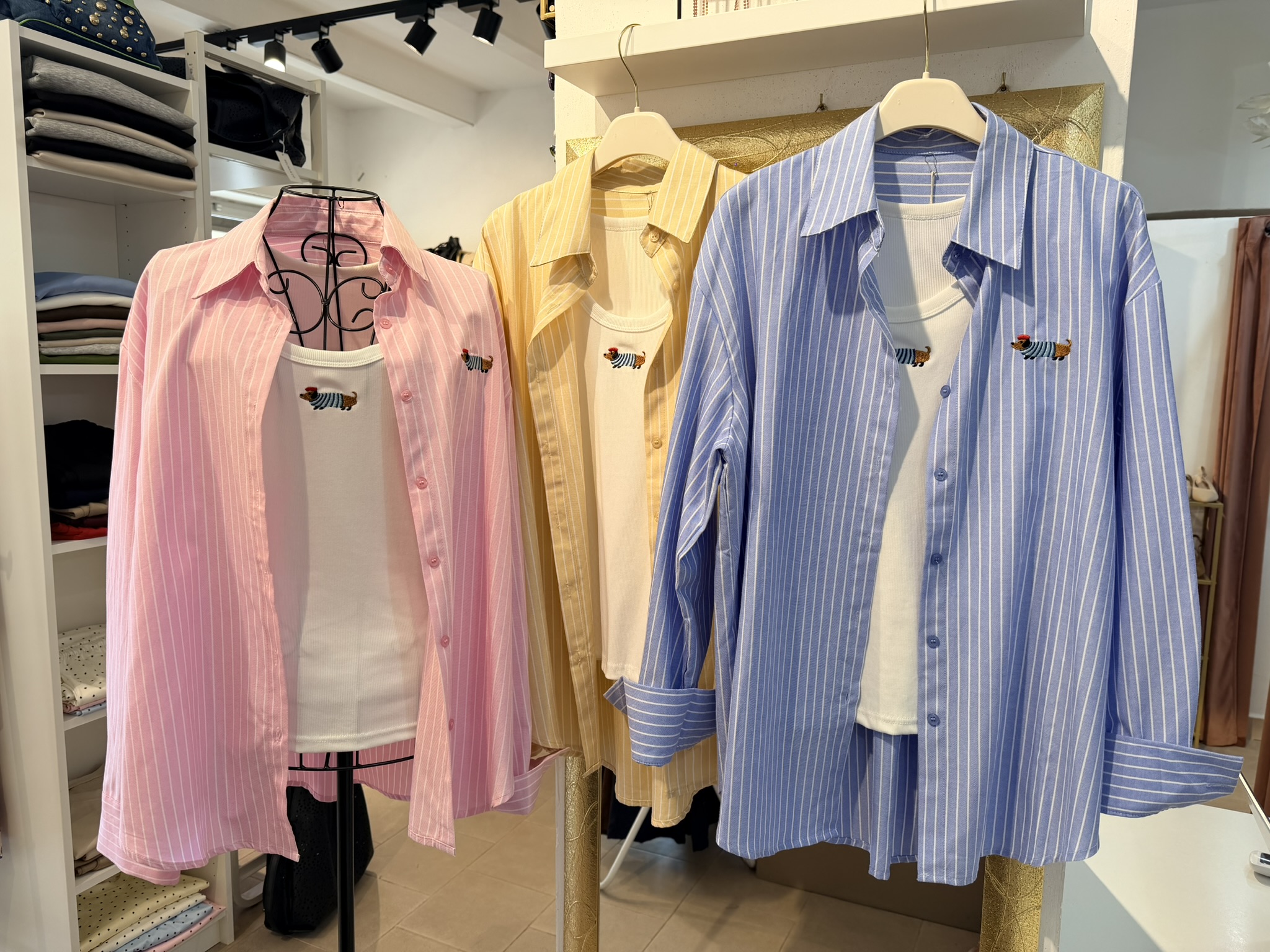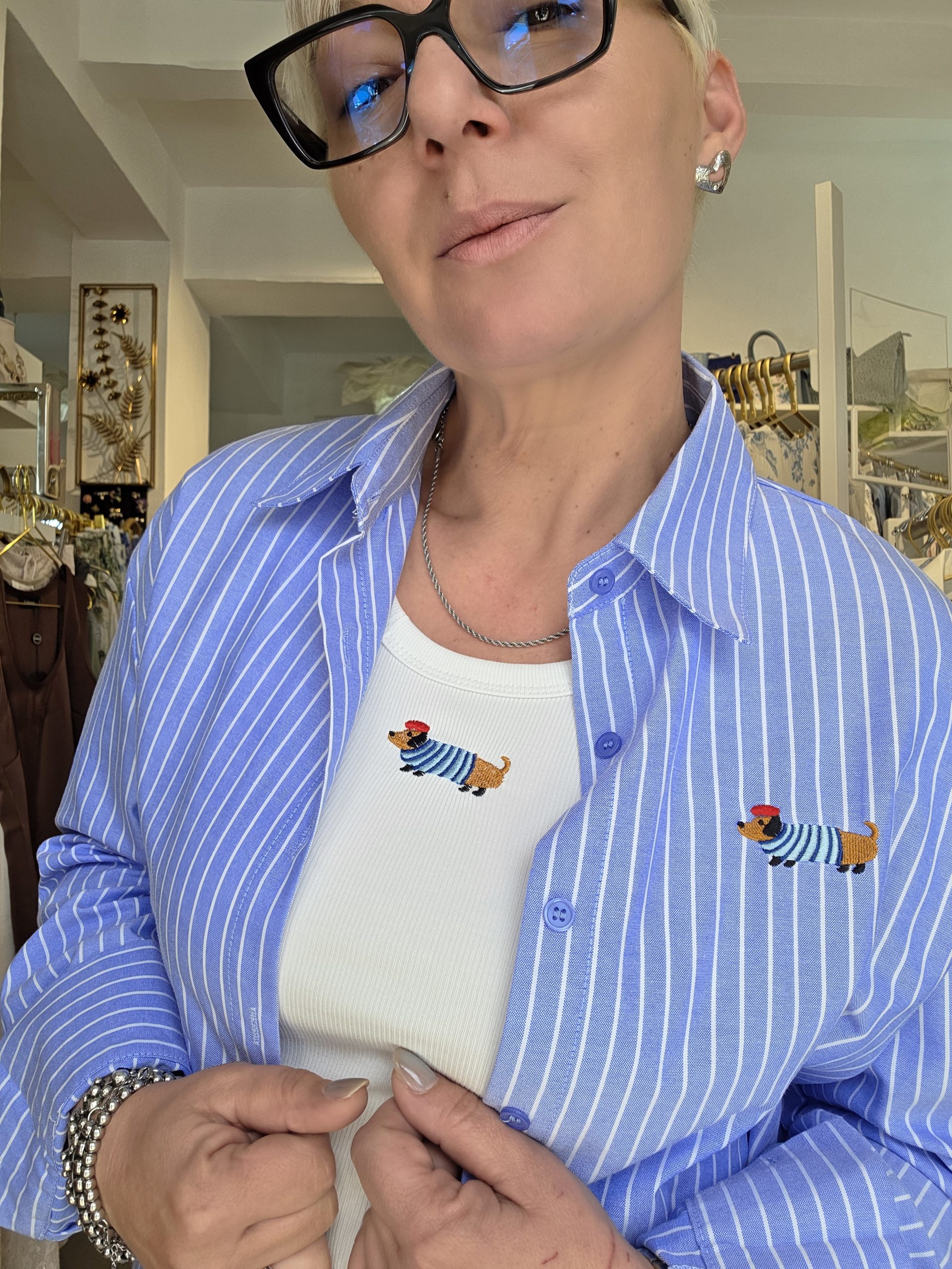 Camicia oversize gessata con bassotto ricamato, con top aderente