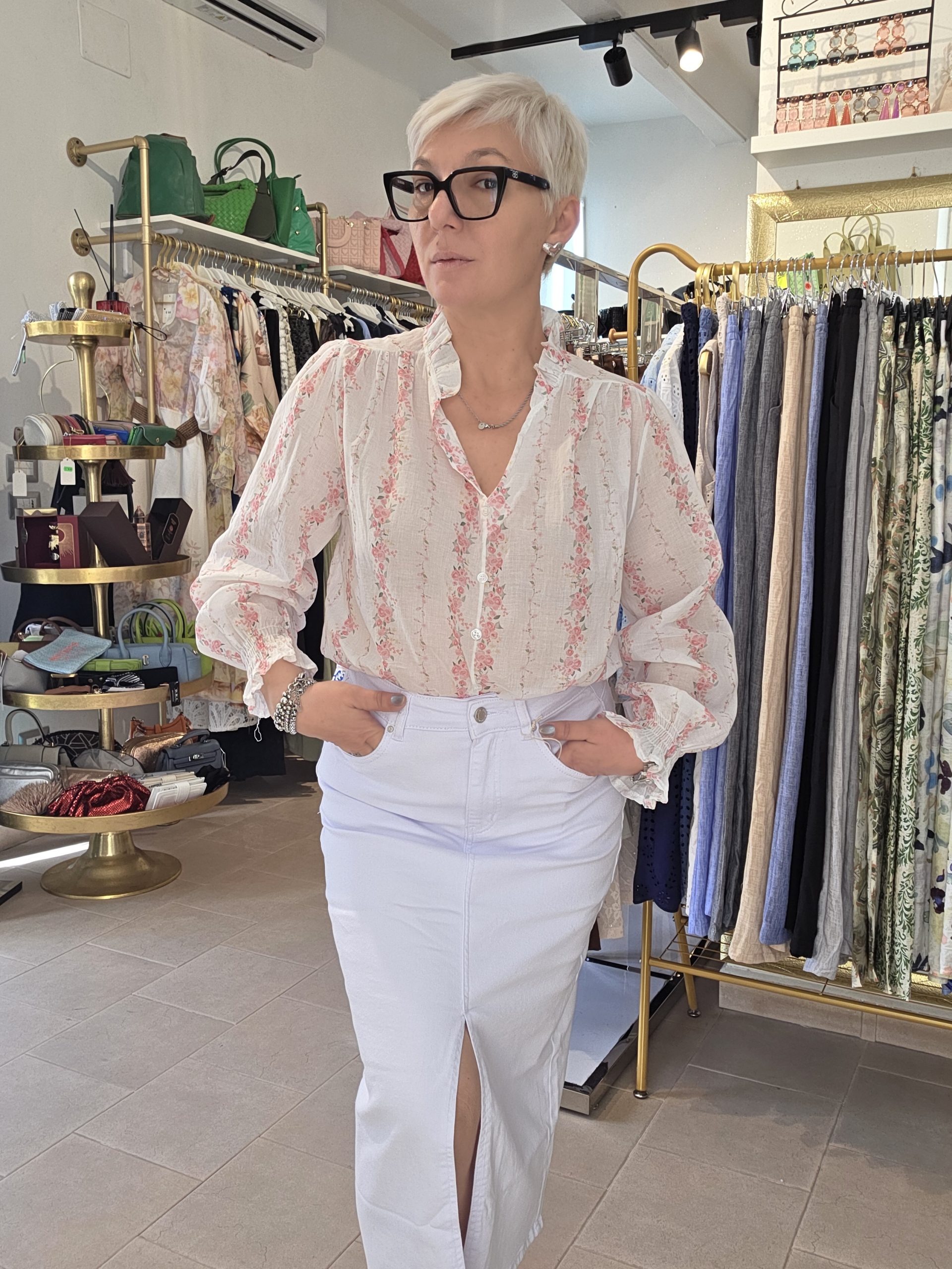 Casacca in voile di cotone con motivo delicato a fiori rosa, bottoni applicati