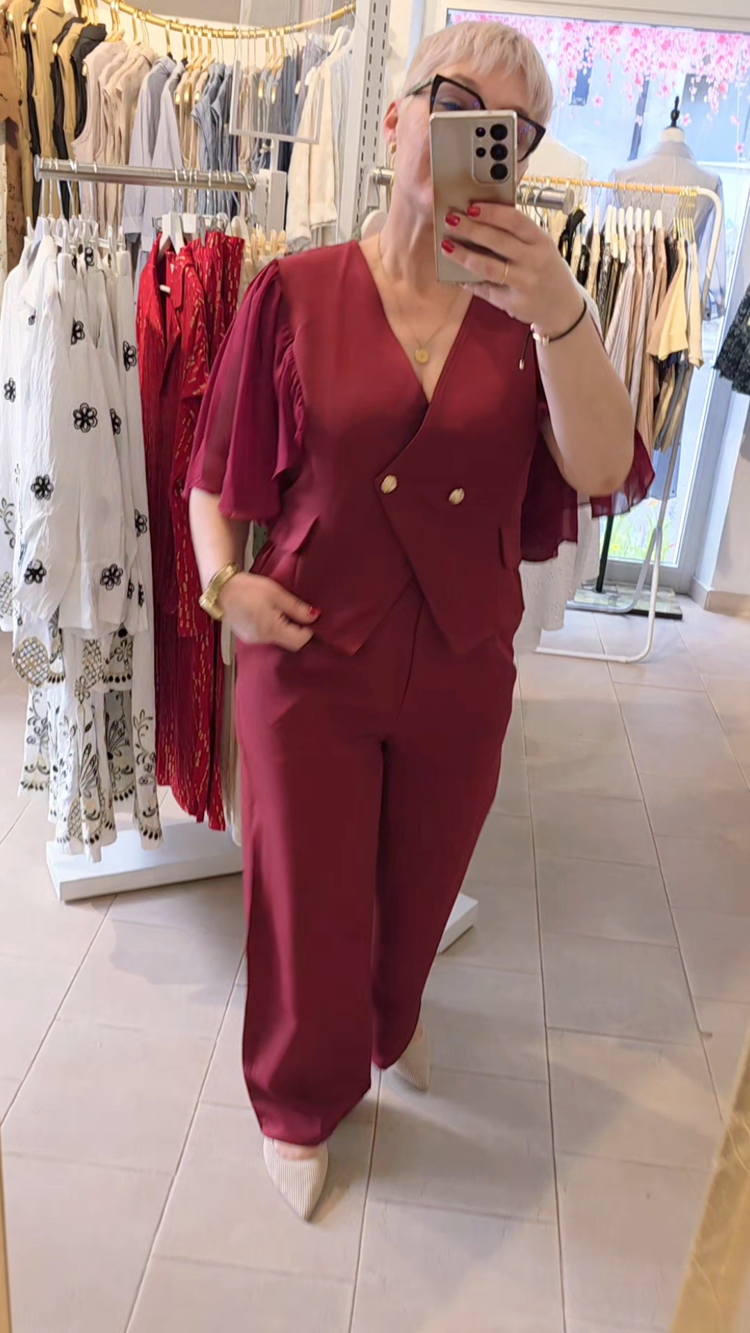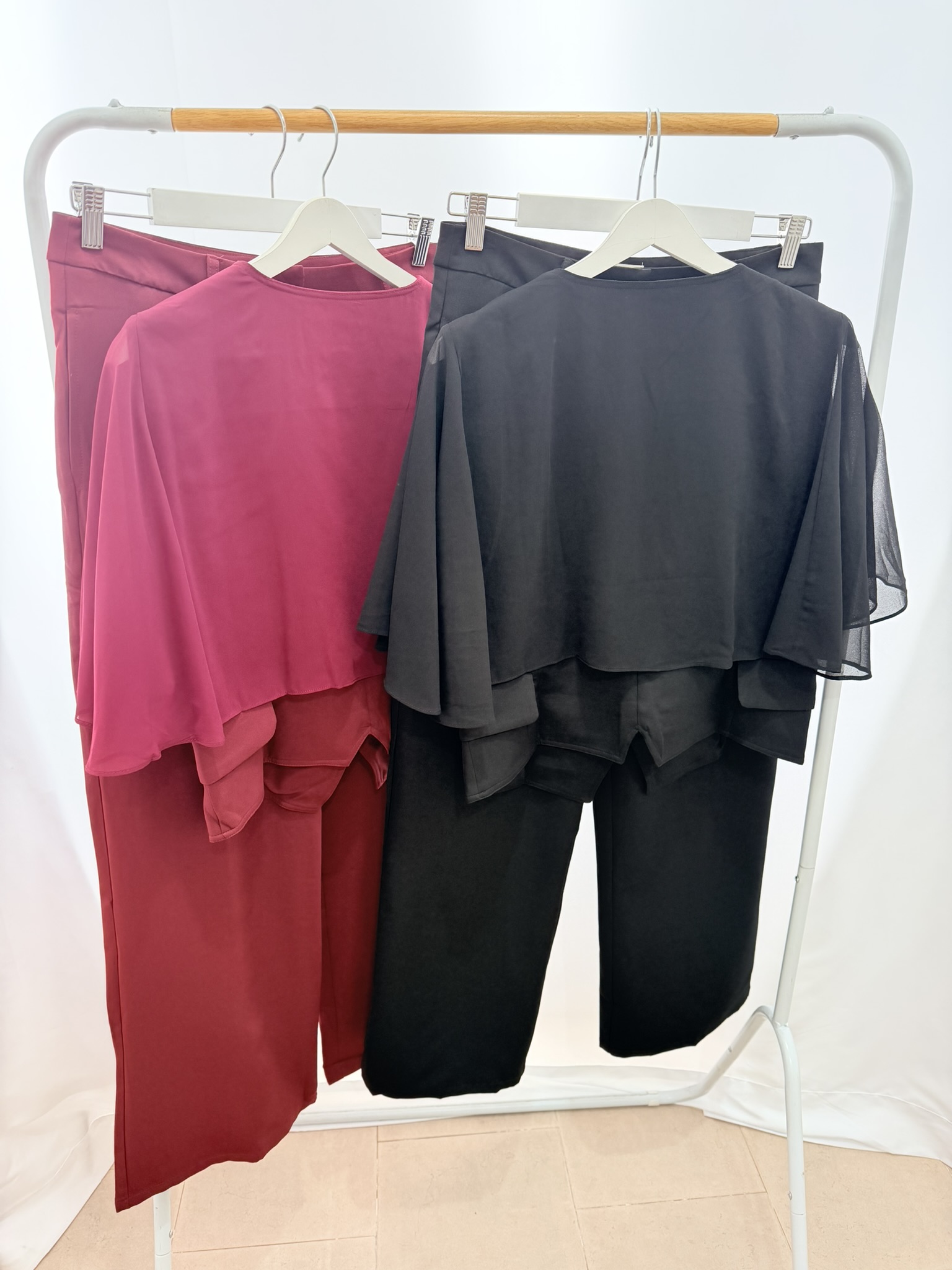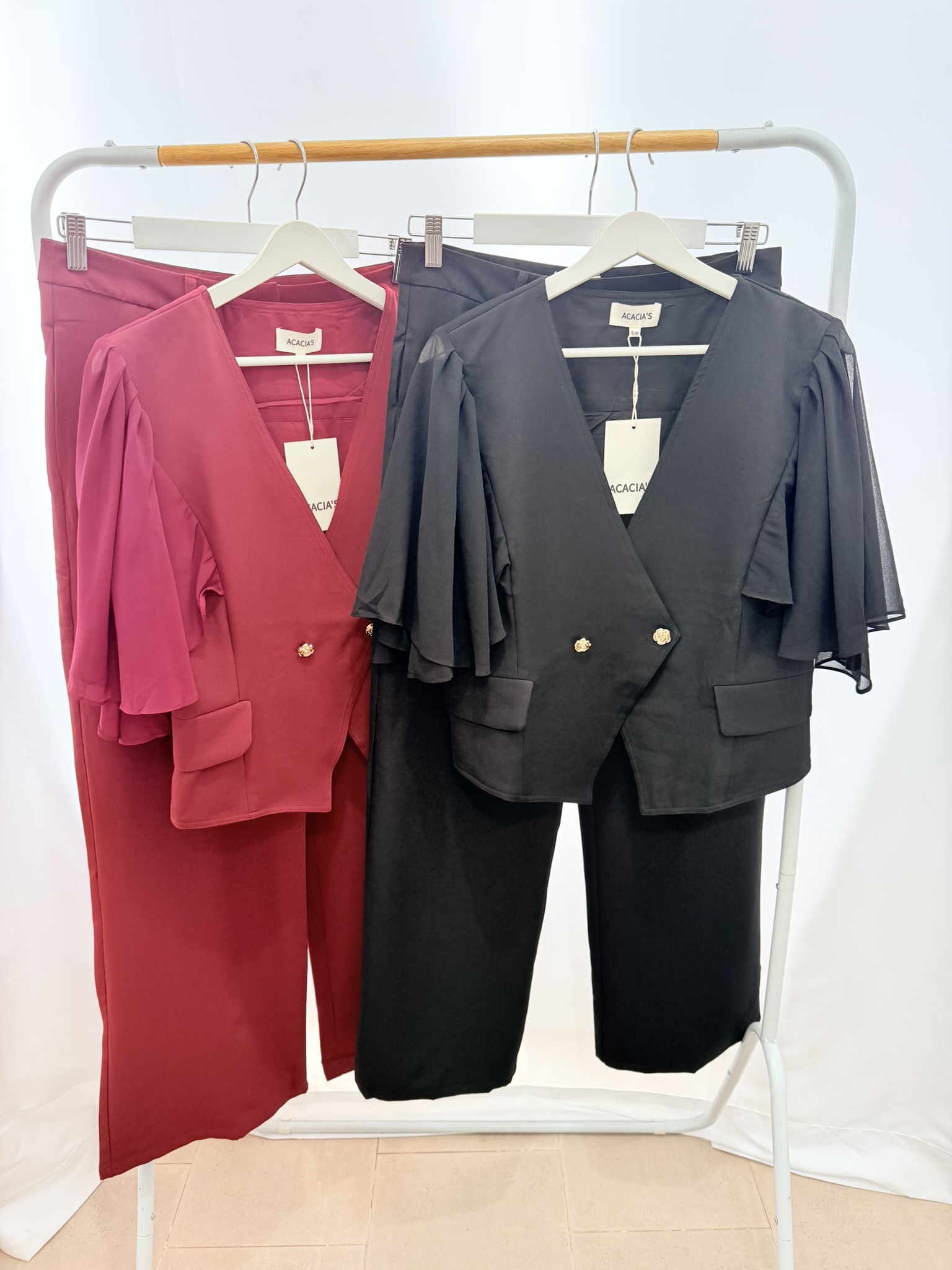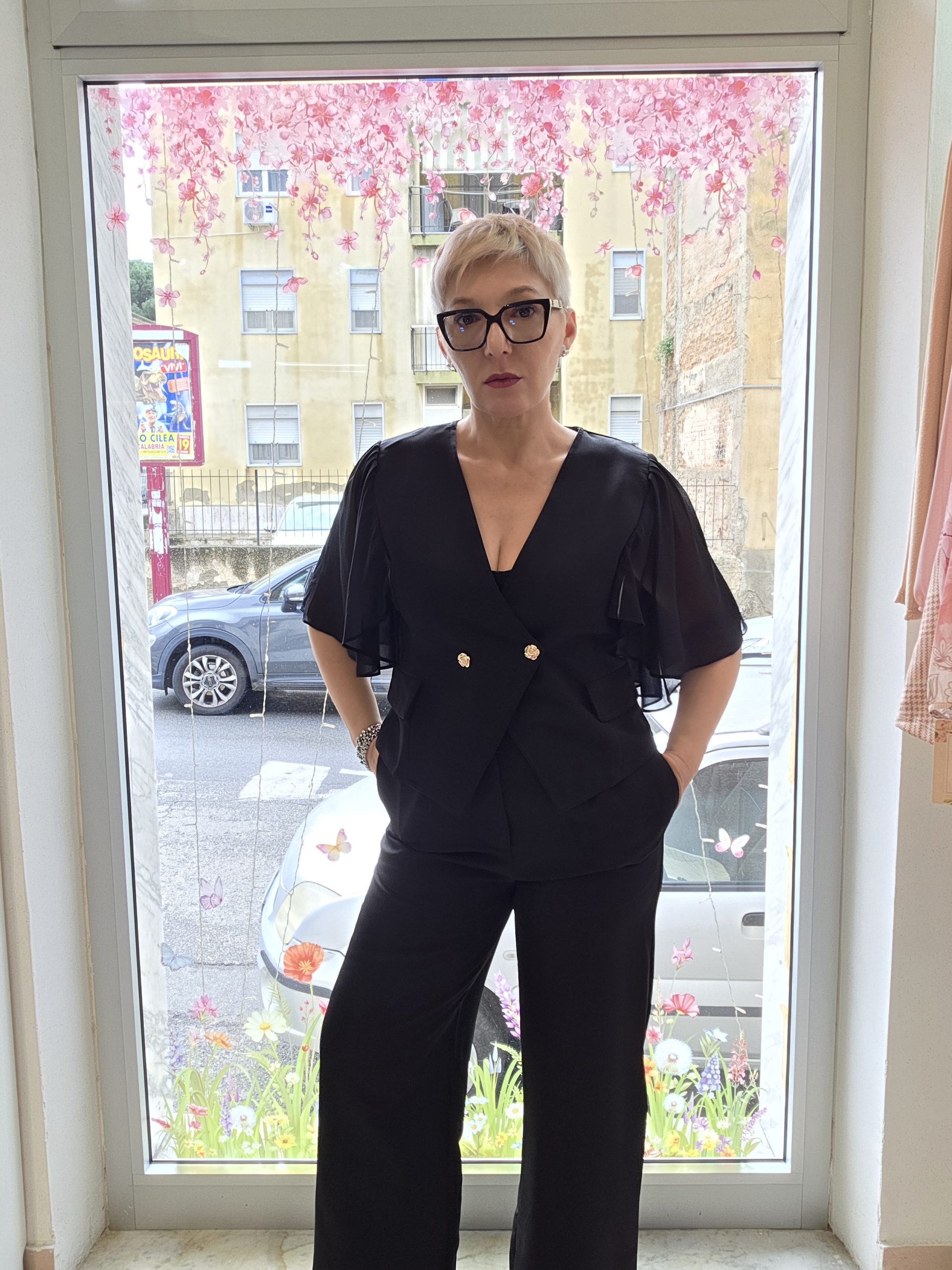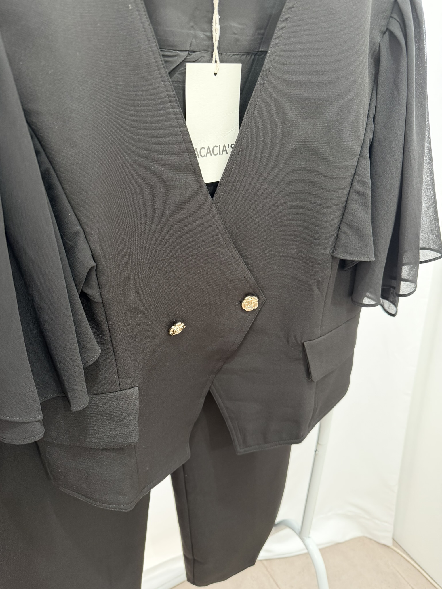Completo composto da giacca manica smanicata corta con volant sulle spalle, pantalone sartoriale
