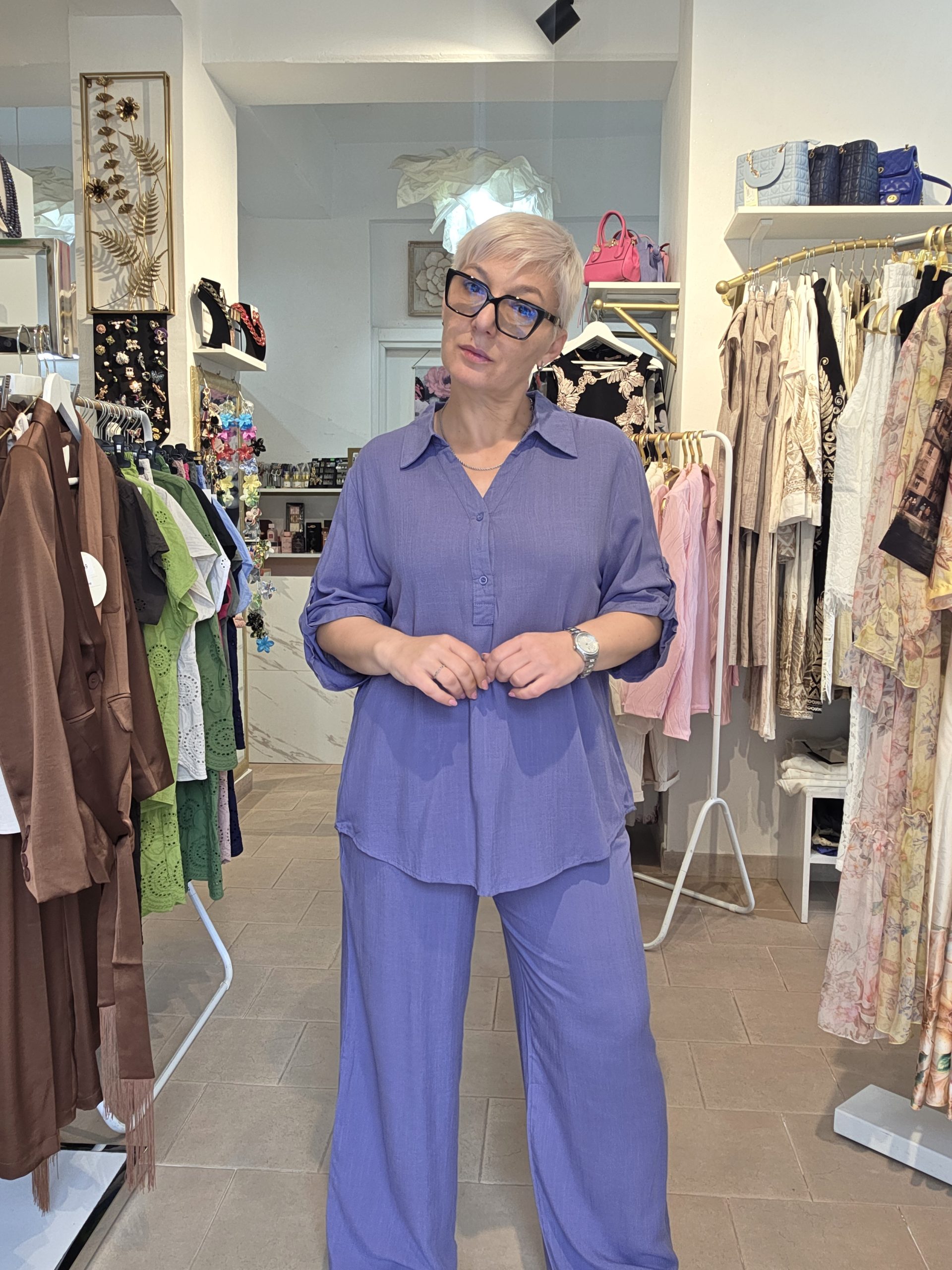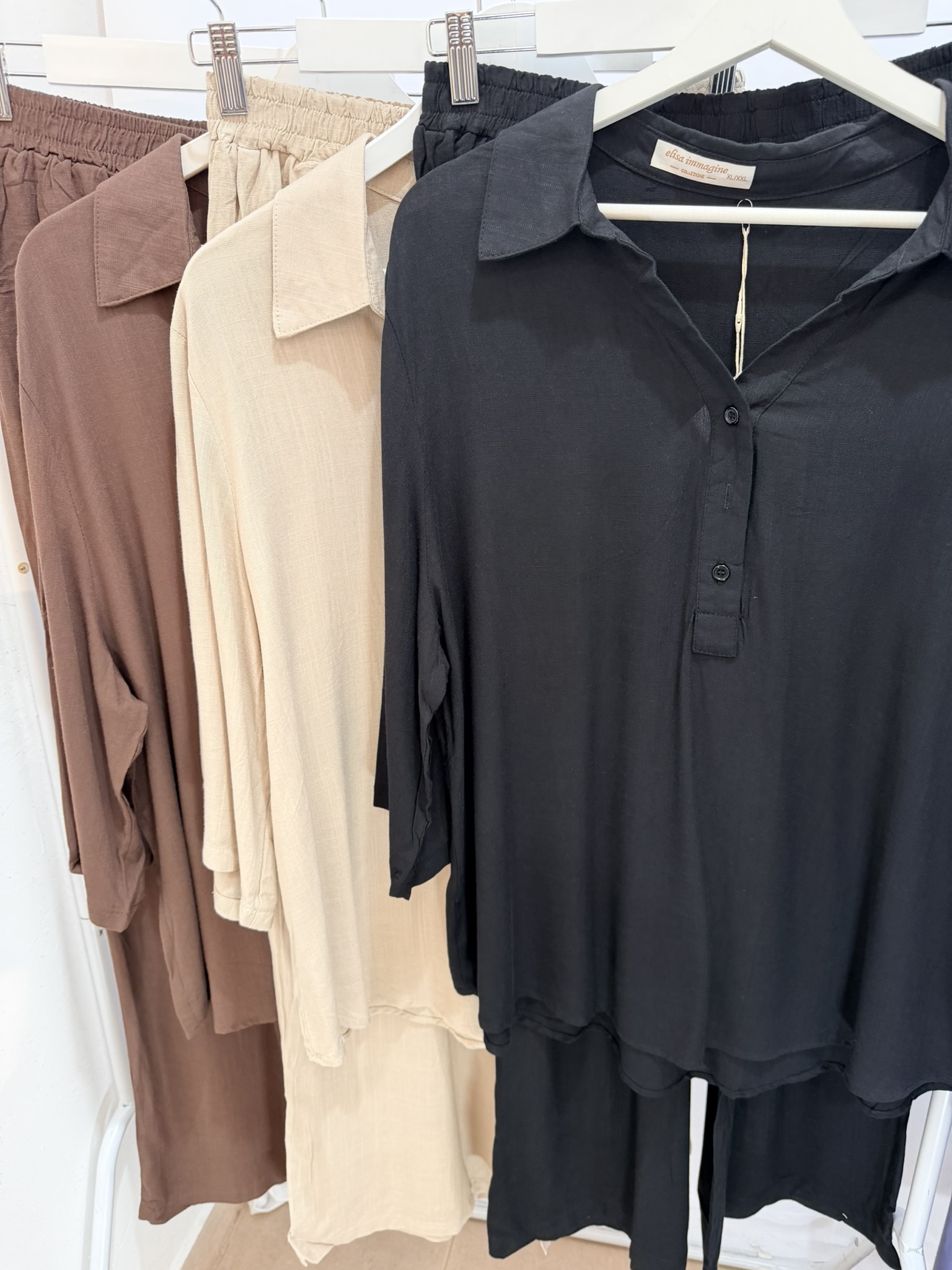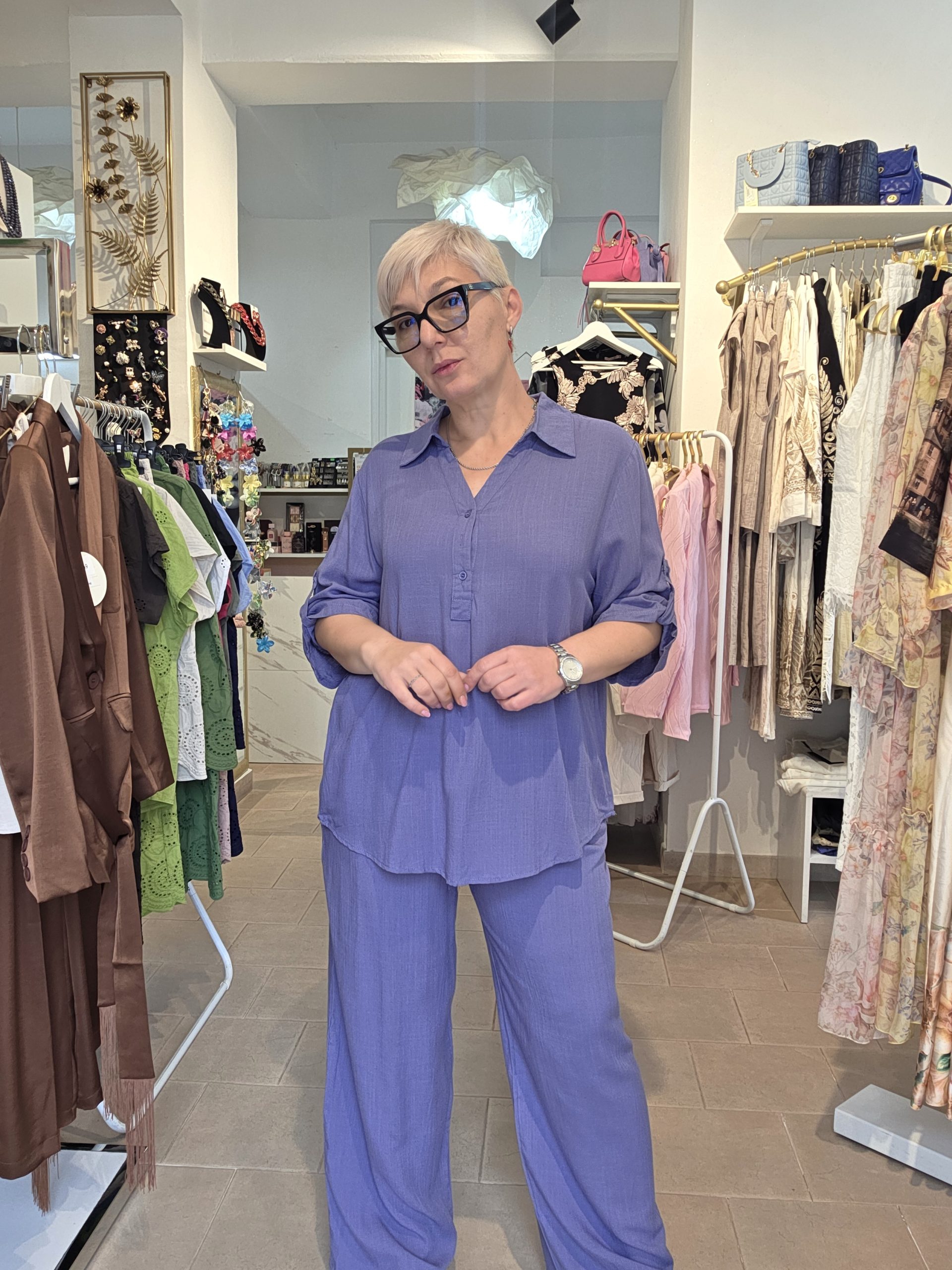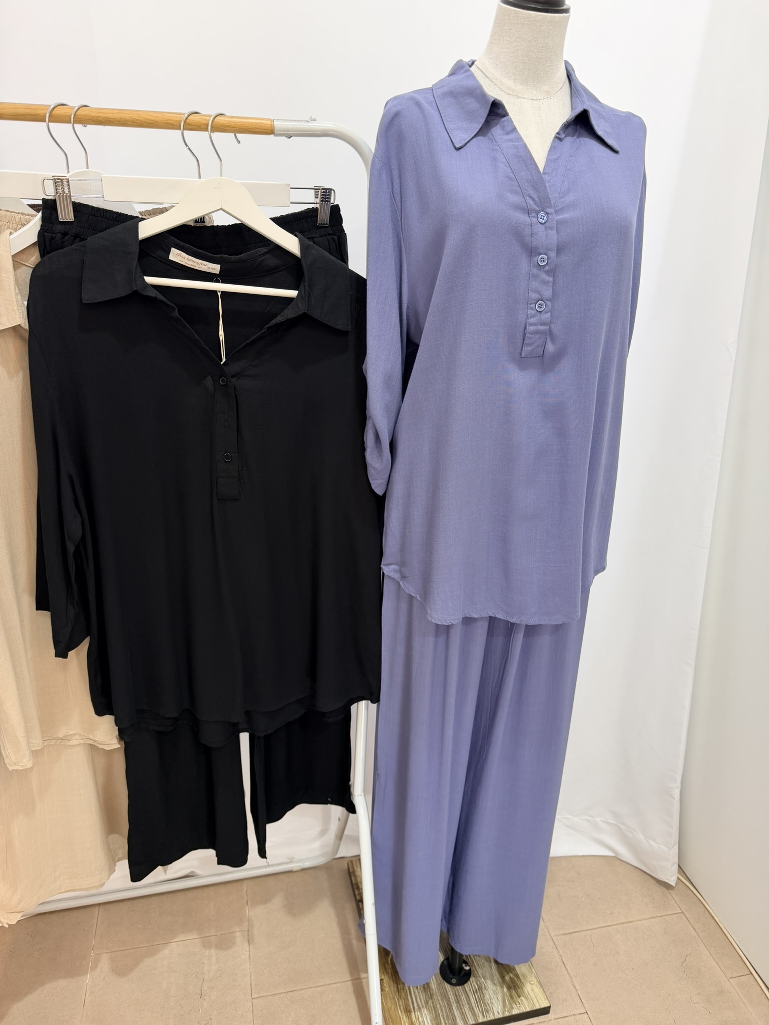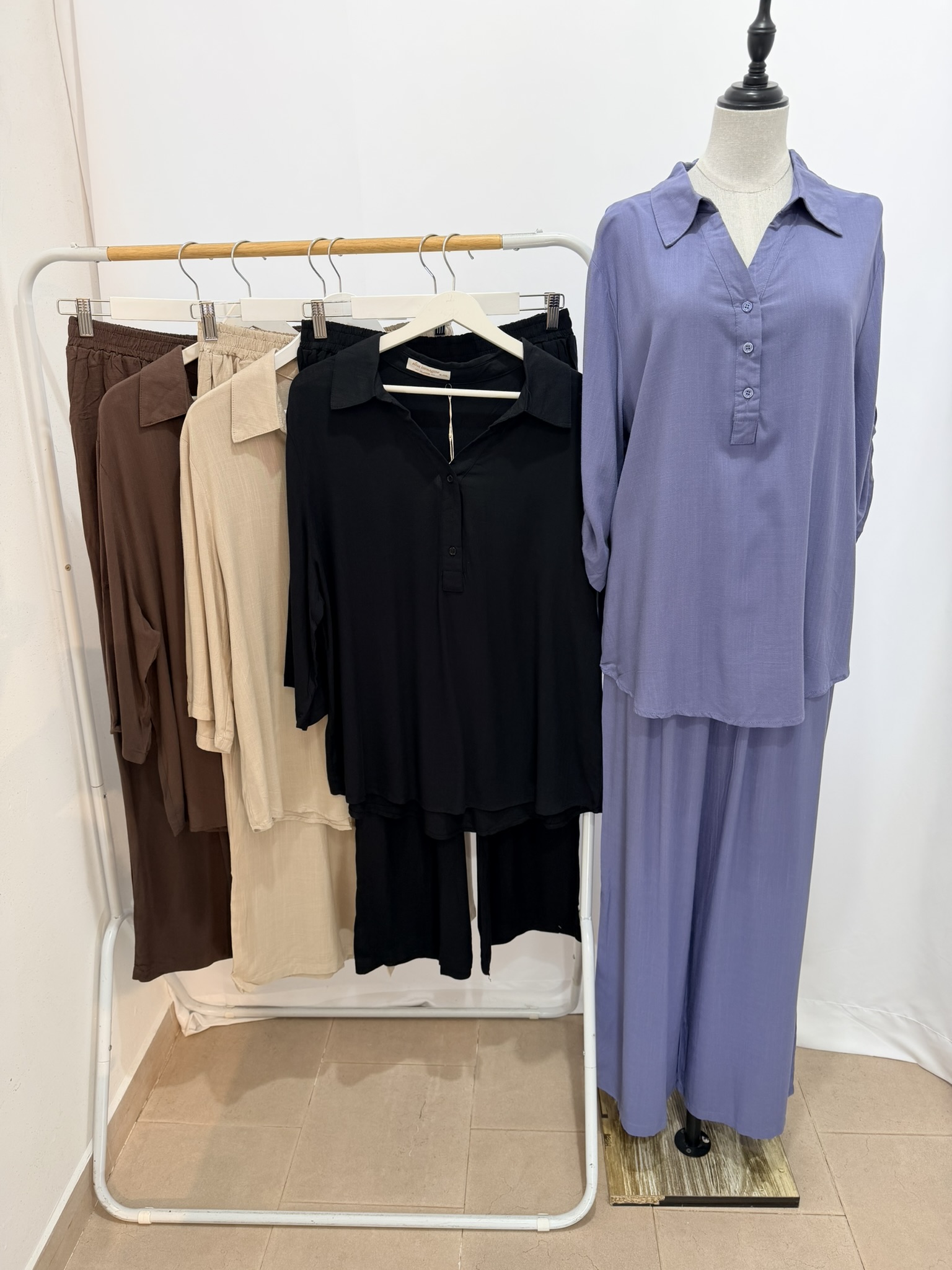 Completo in misto cotone e viscosa, composto da casacca morbida con colletto e manica 3/4 e pantalone con elastico. vestibilità morbida