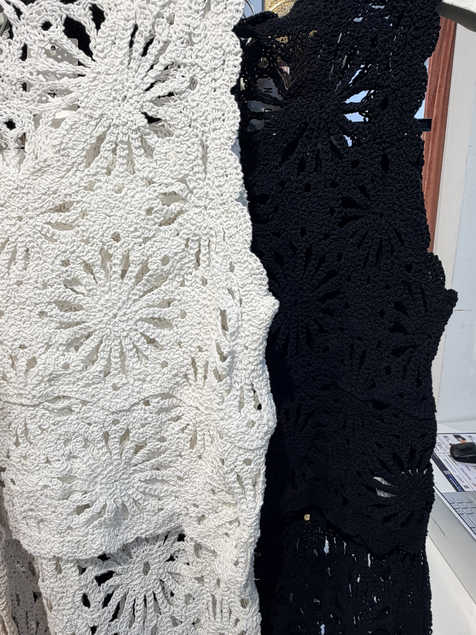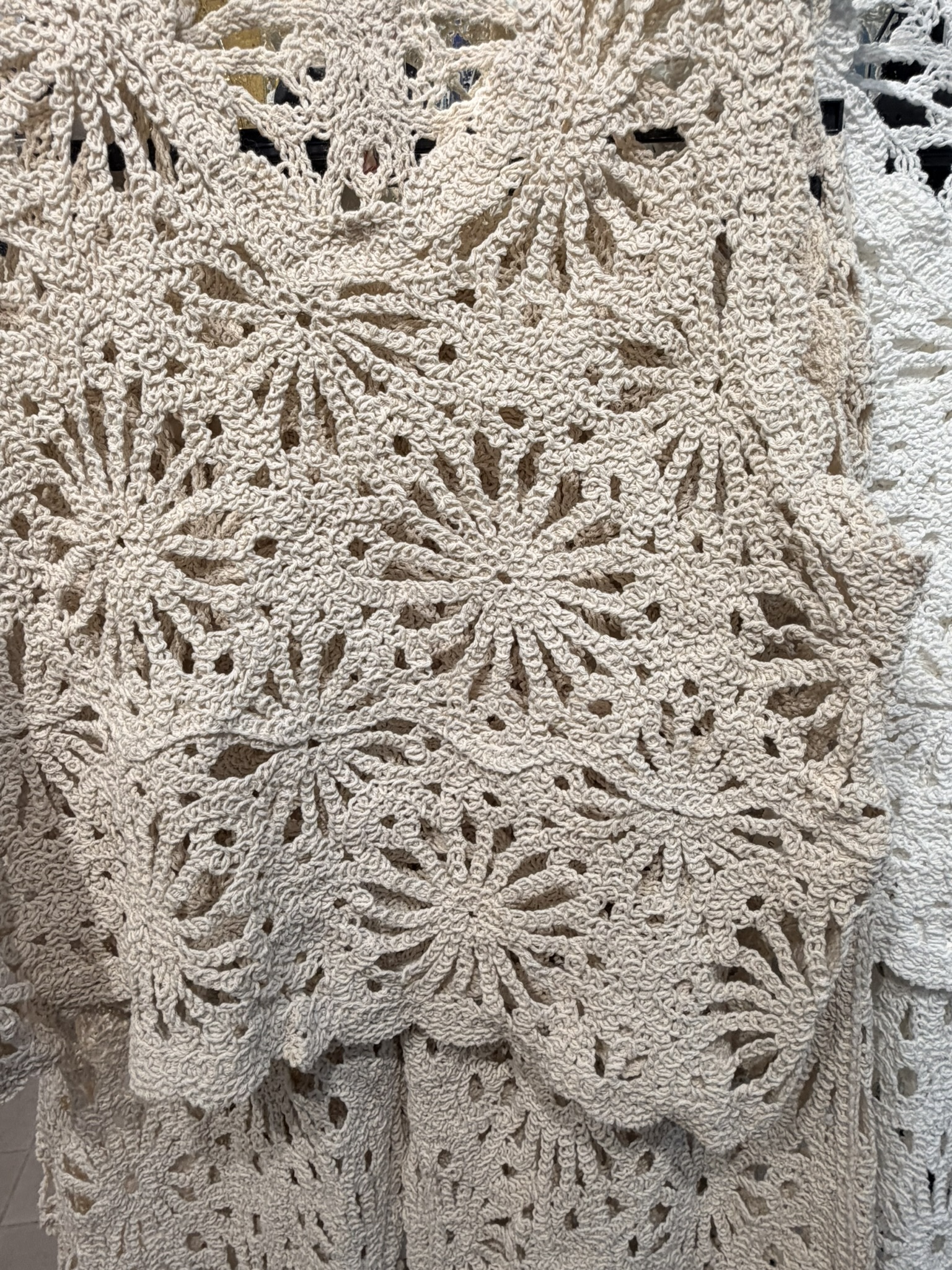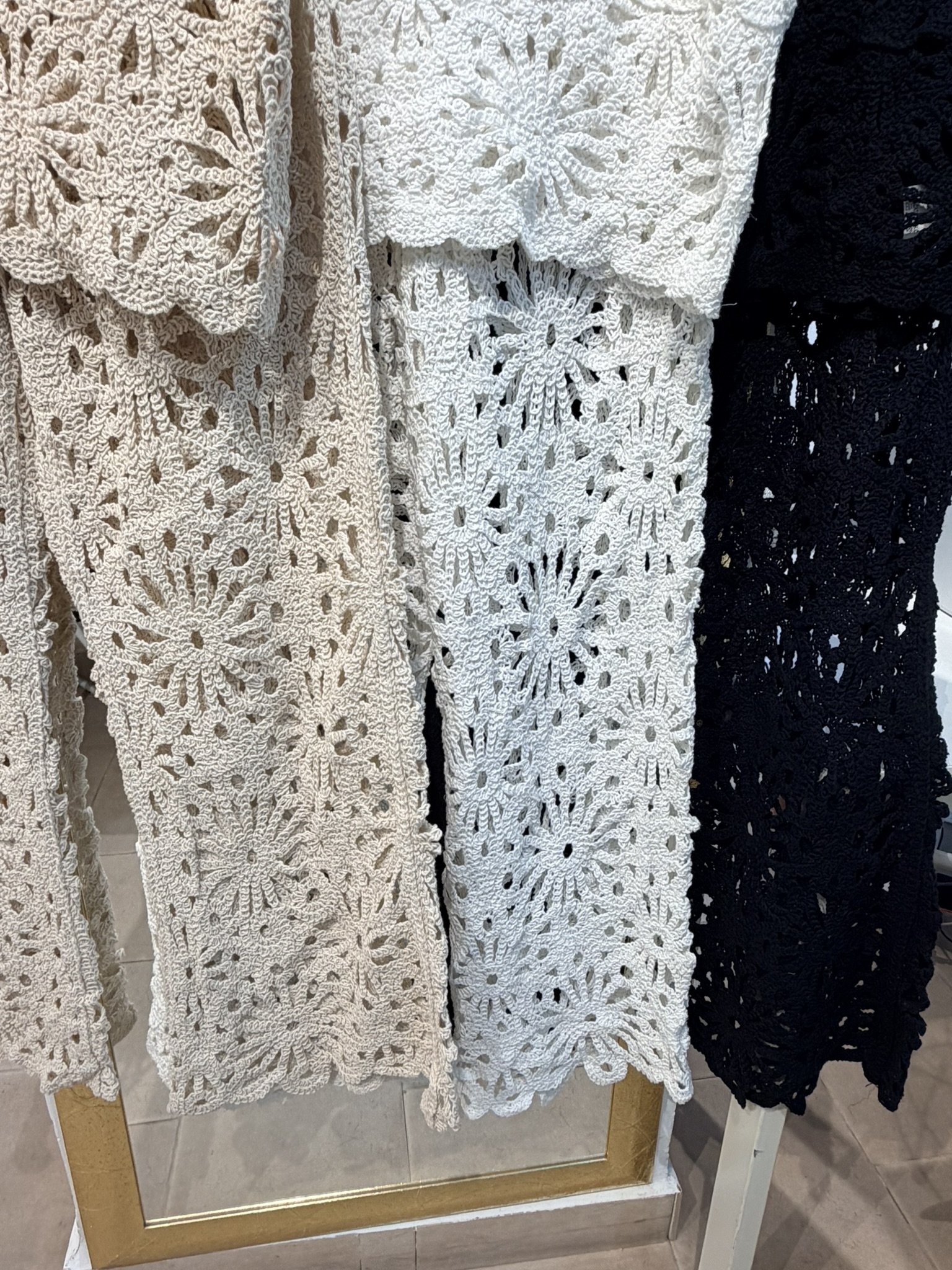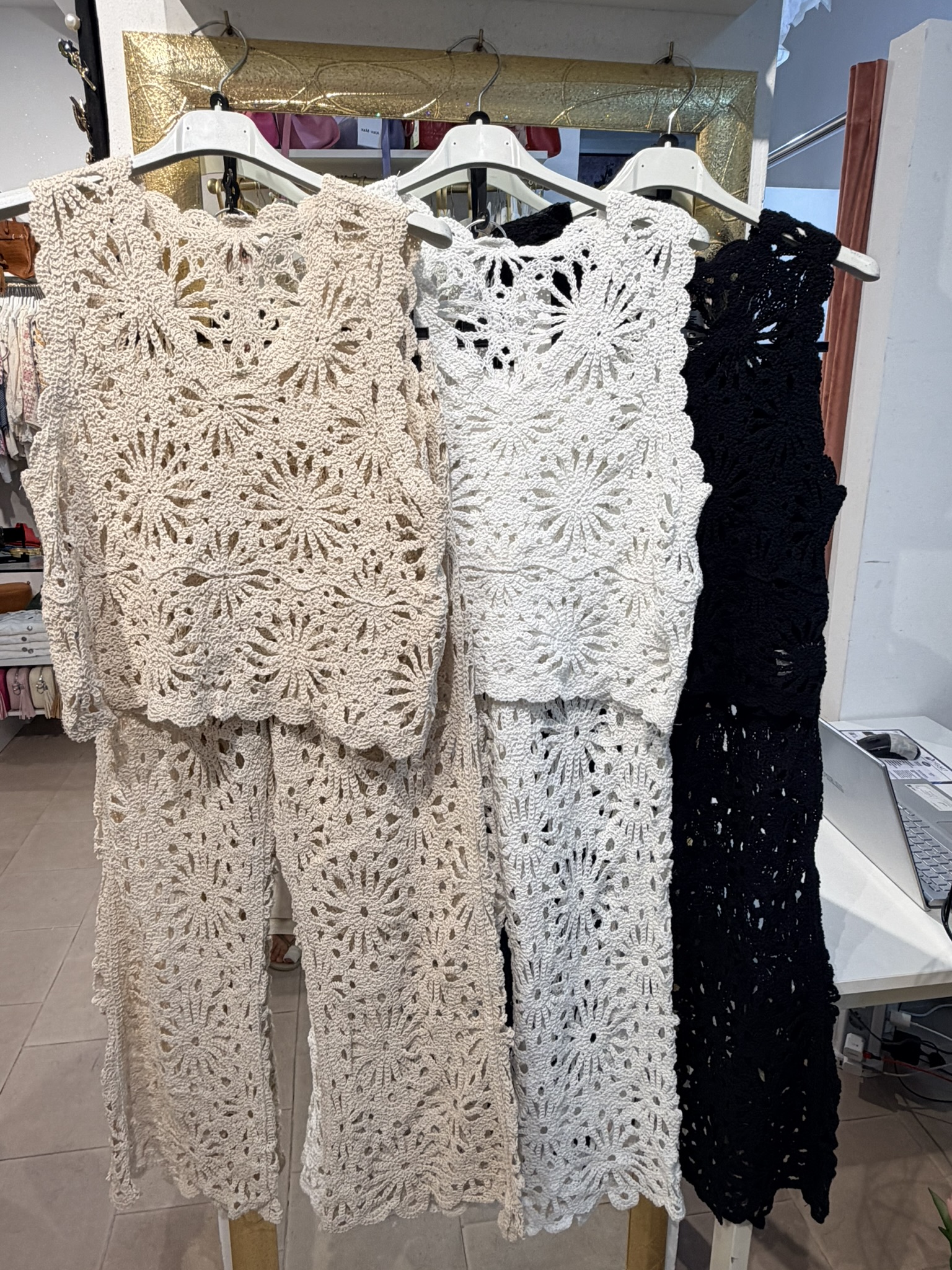 Completo in macramè, taglia unica vestibilità dalla XS alla L, composto da top e pantalone foderato con pantaloncino.