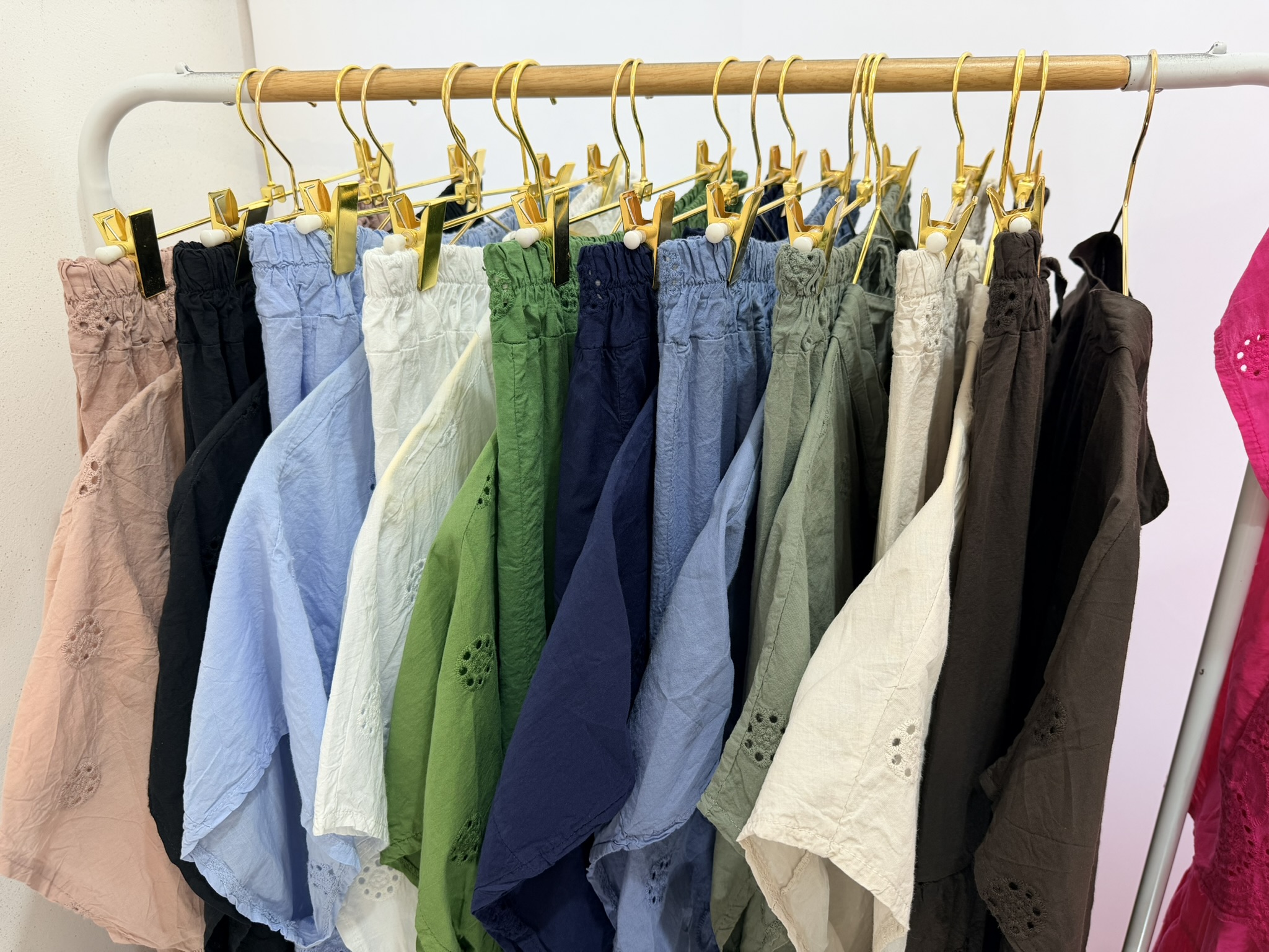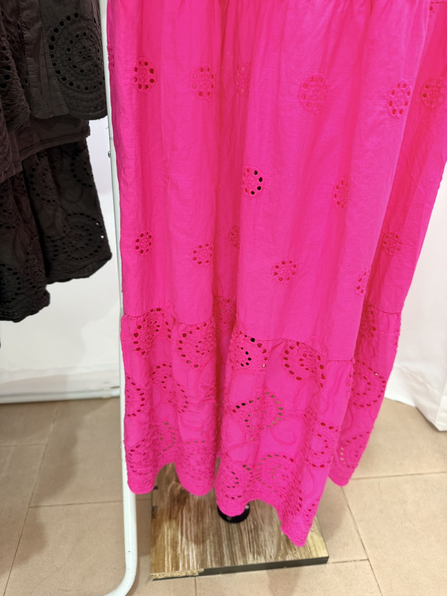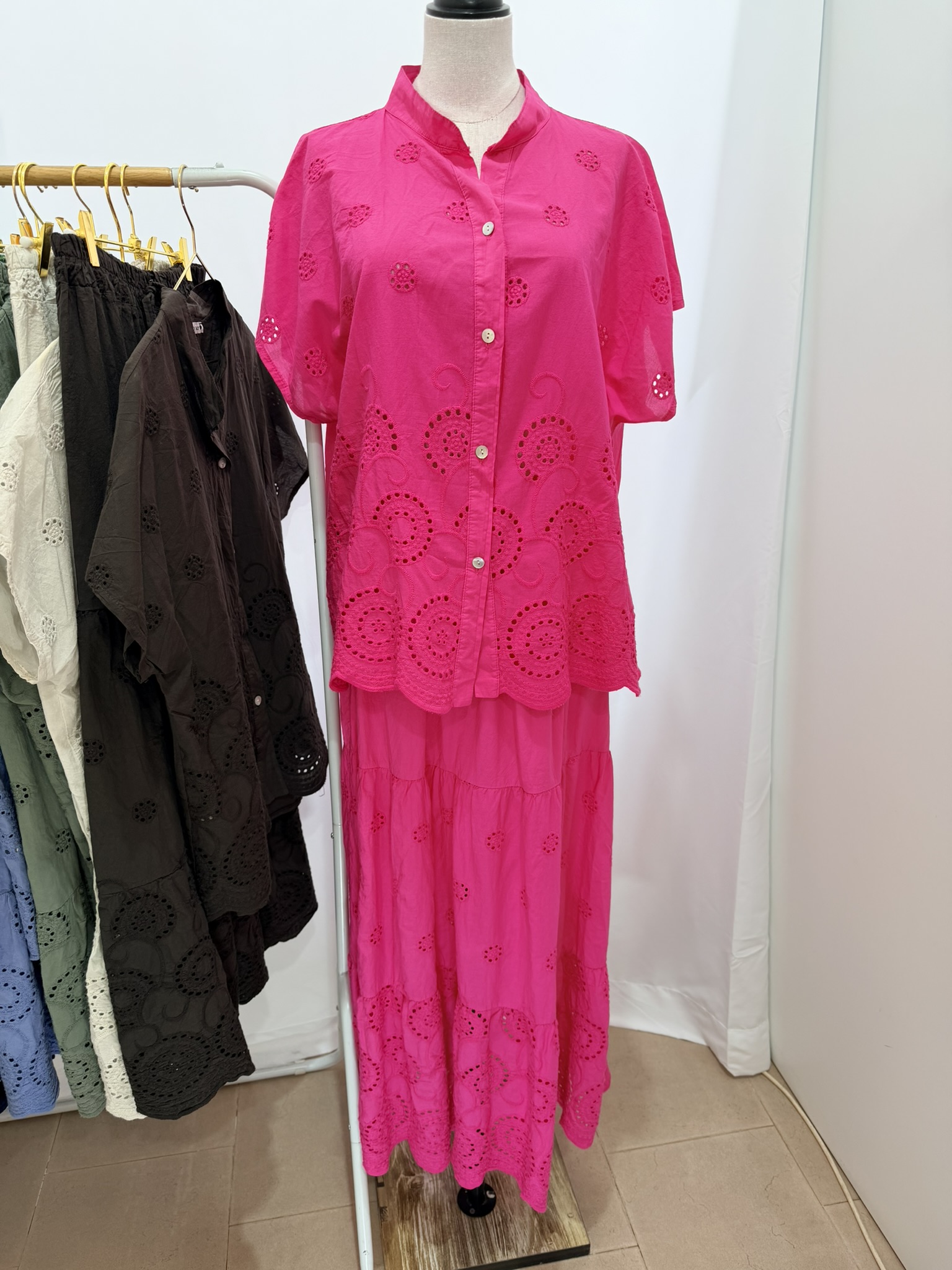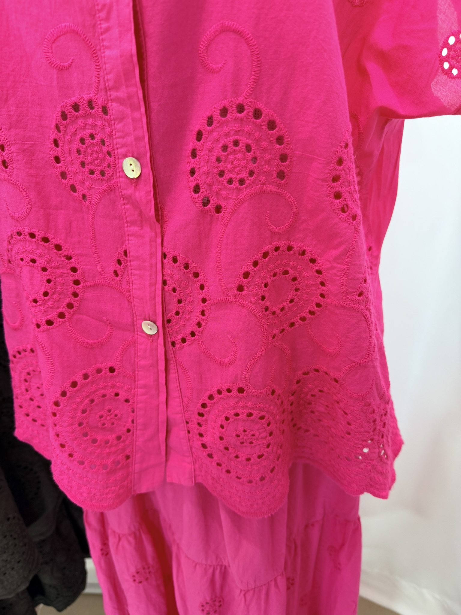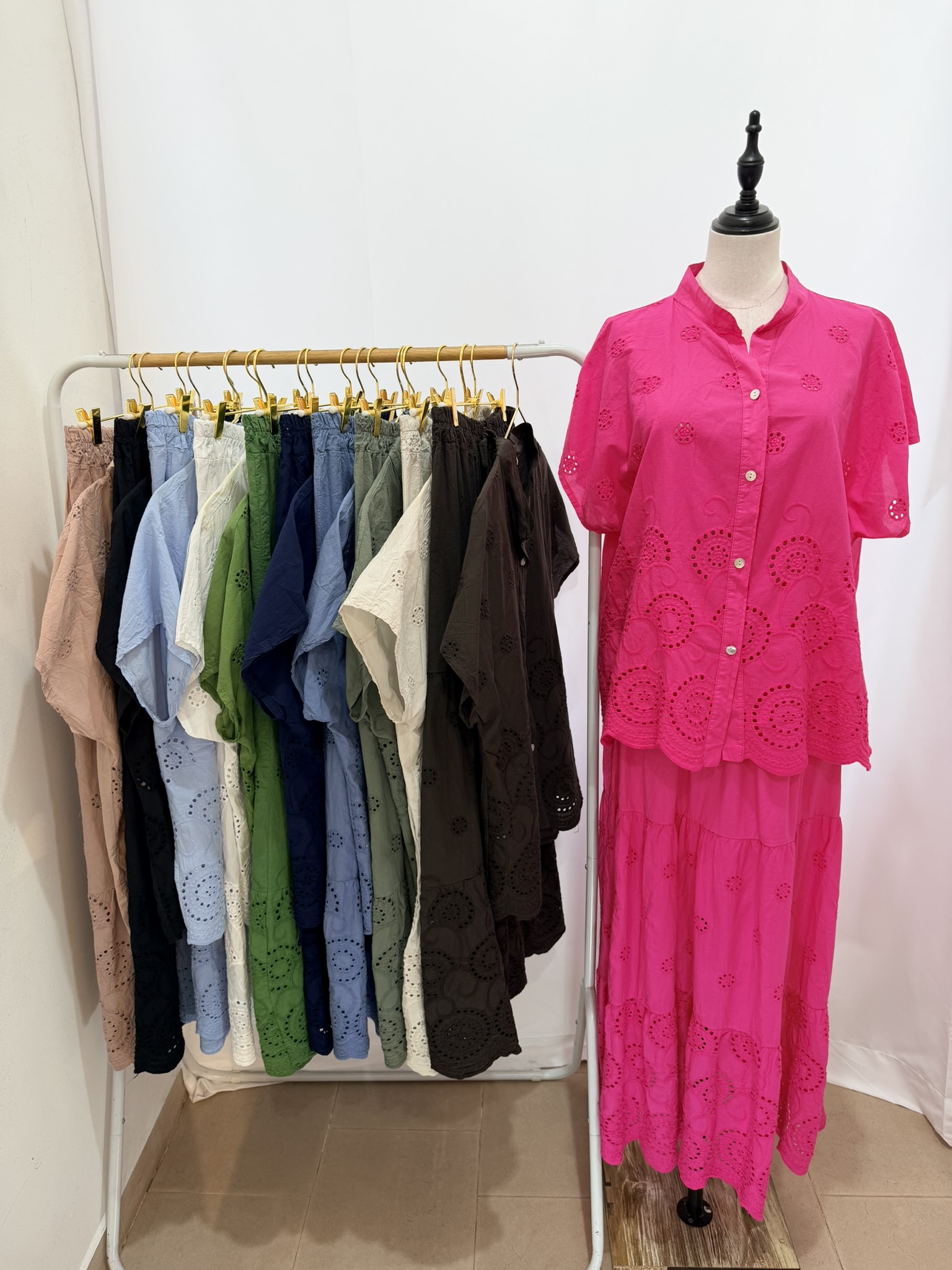 Completo oversize in sangallo con casacca ampia e gonna con elastico morbido. Vestibilità dalla 46 alla 52