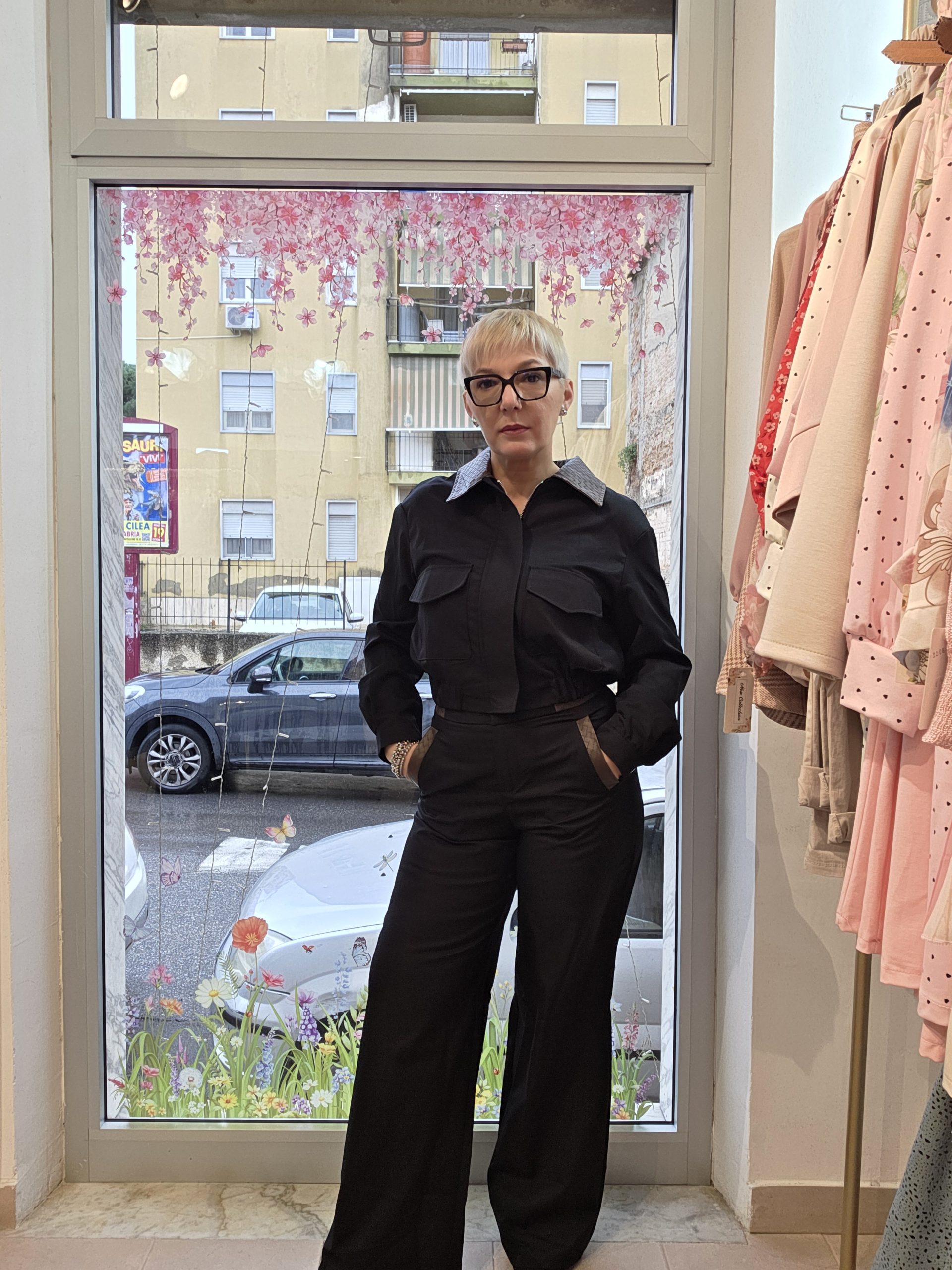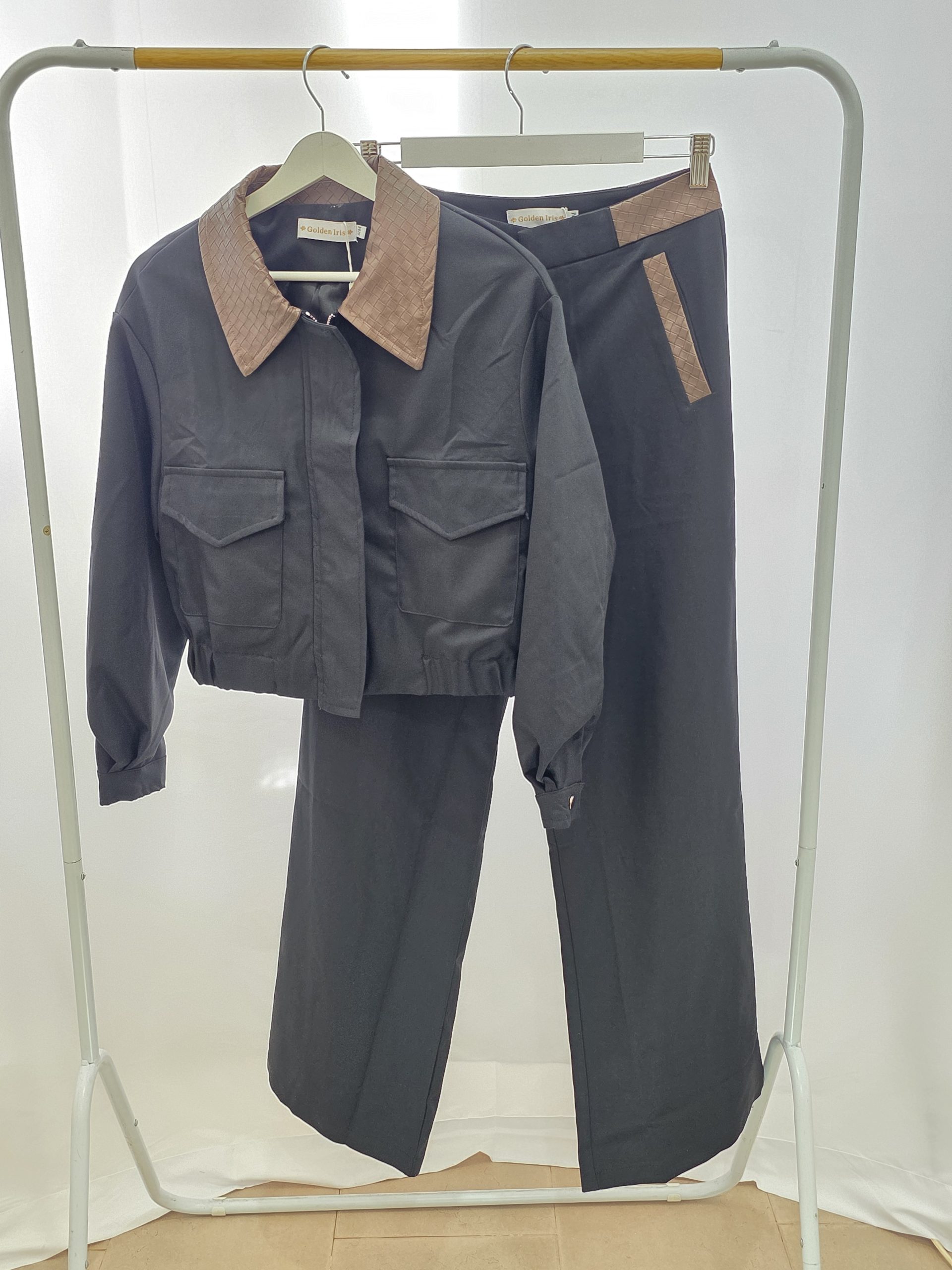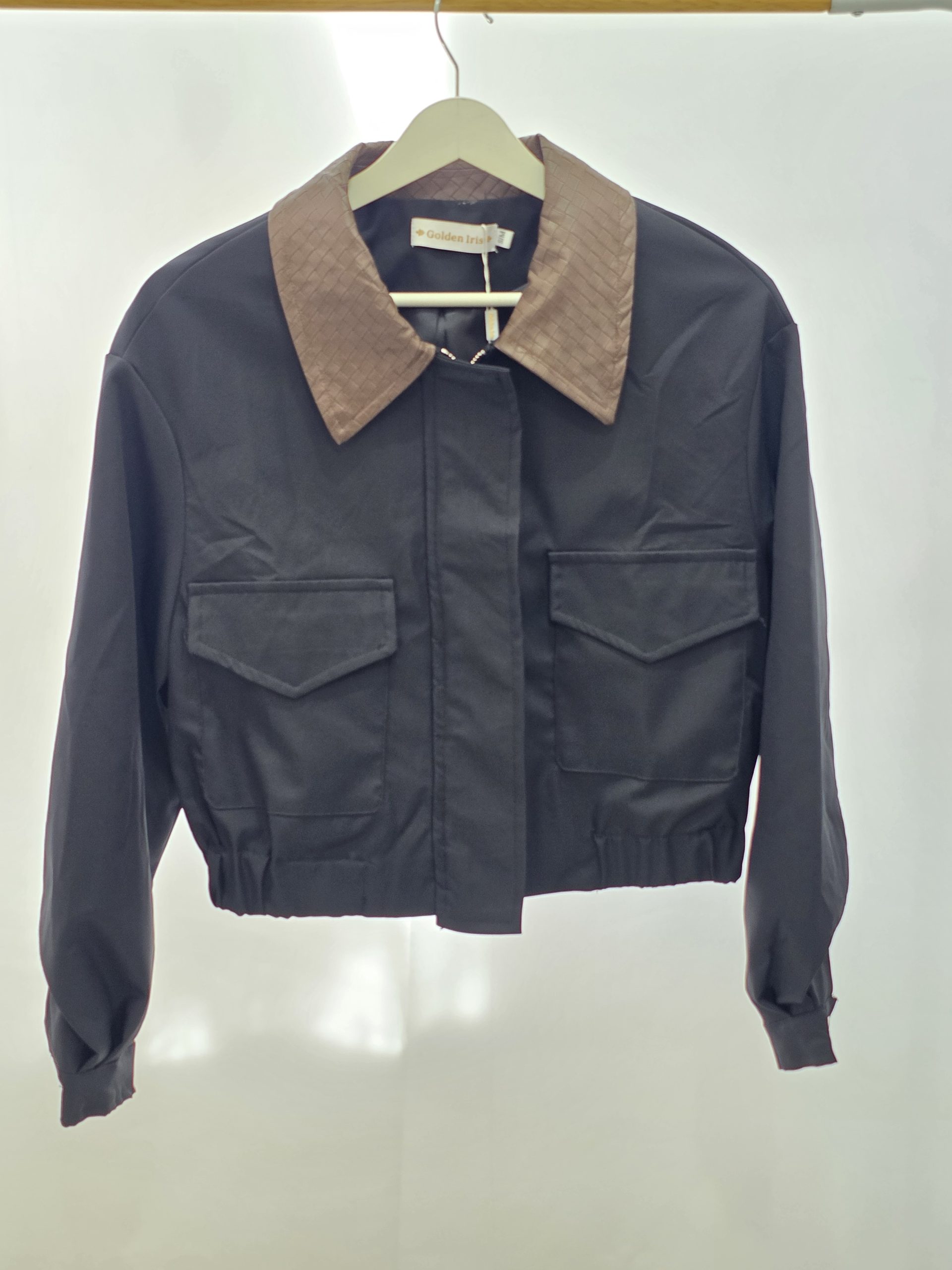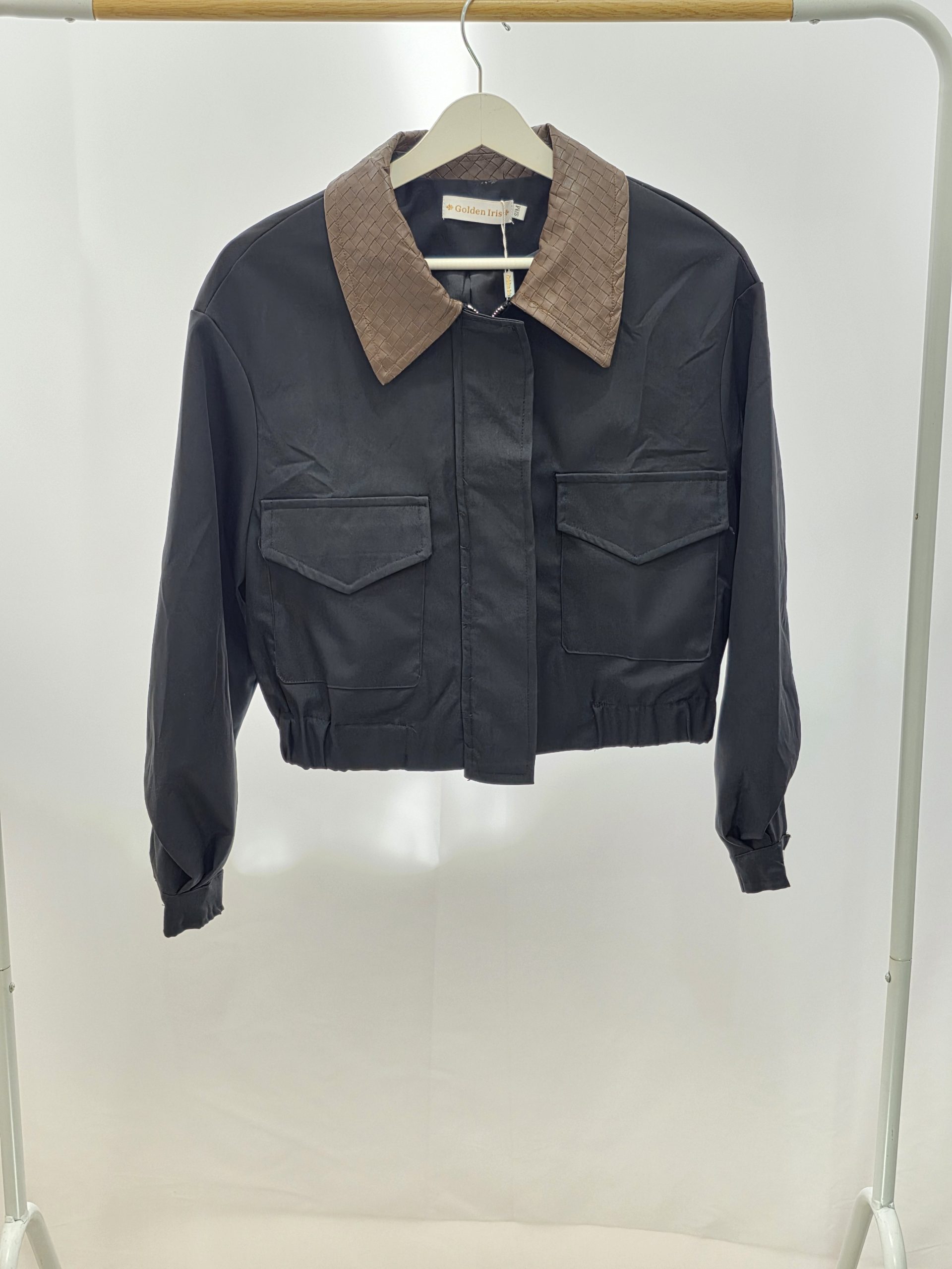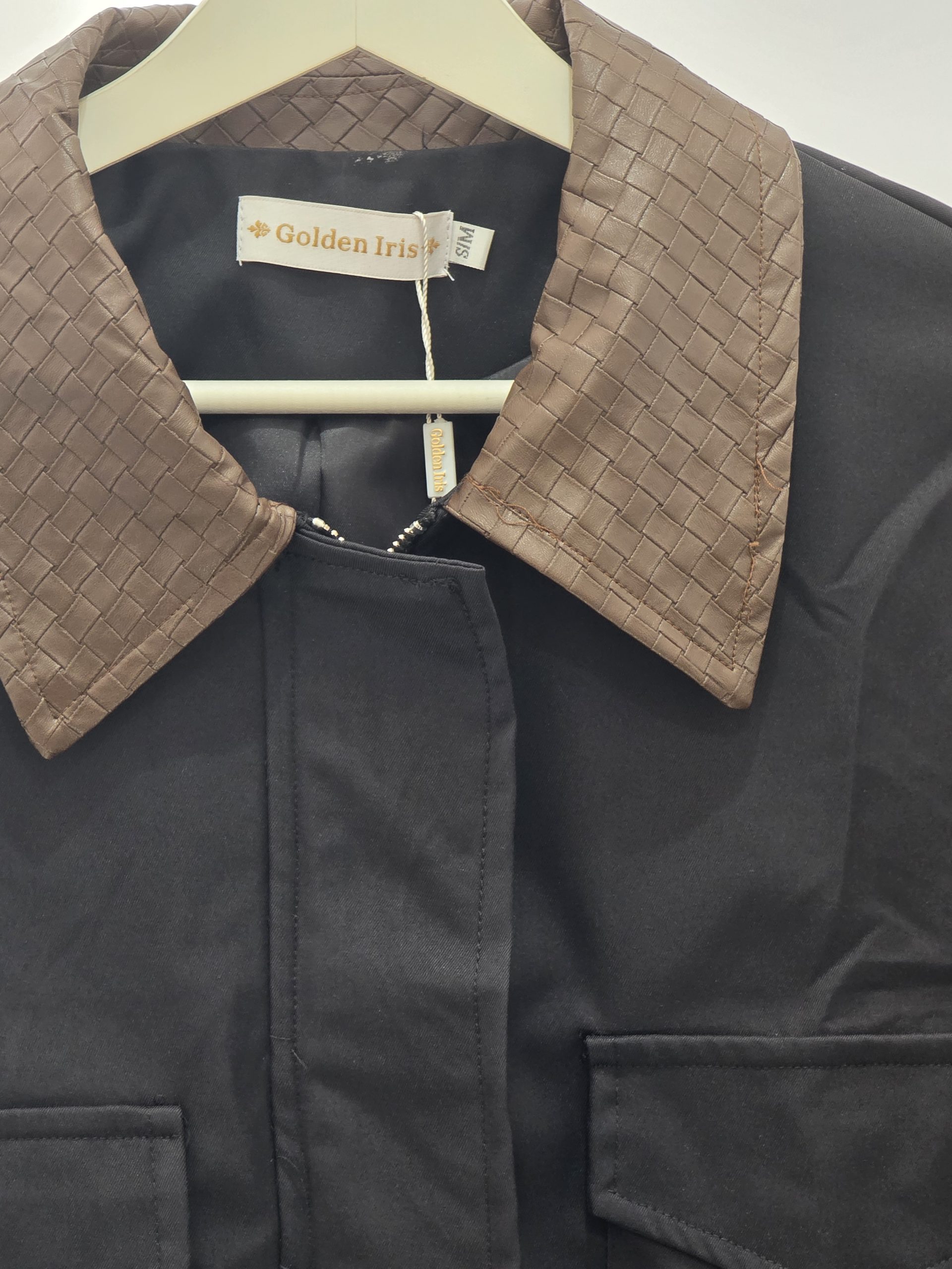 Giubbino corto in cotone foderato con inserti in ecopelle intrecciata. Elastico sul fondo. Da abbinare al pantalone sartoriale.
