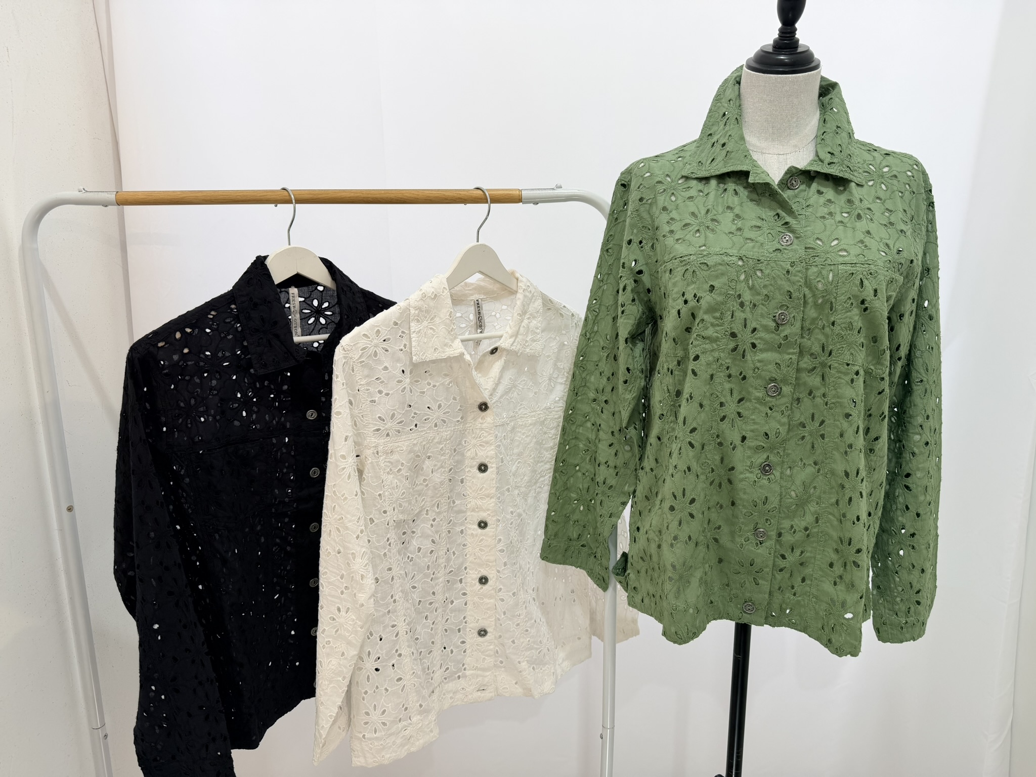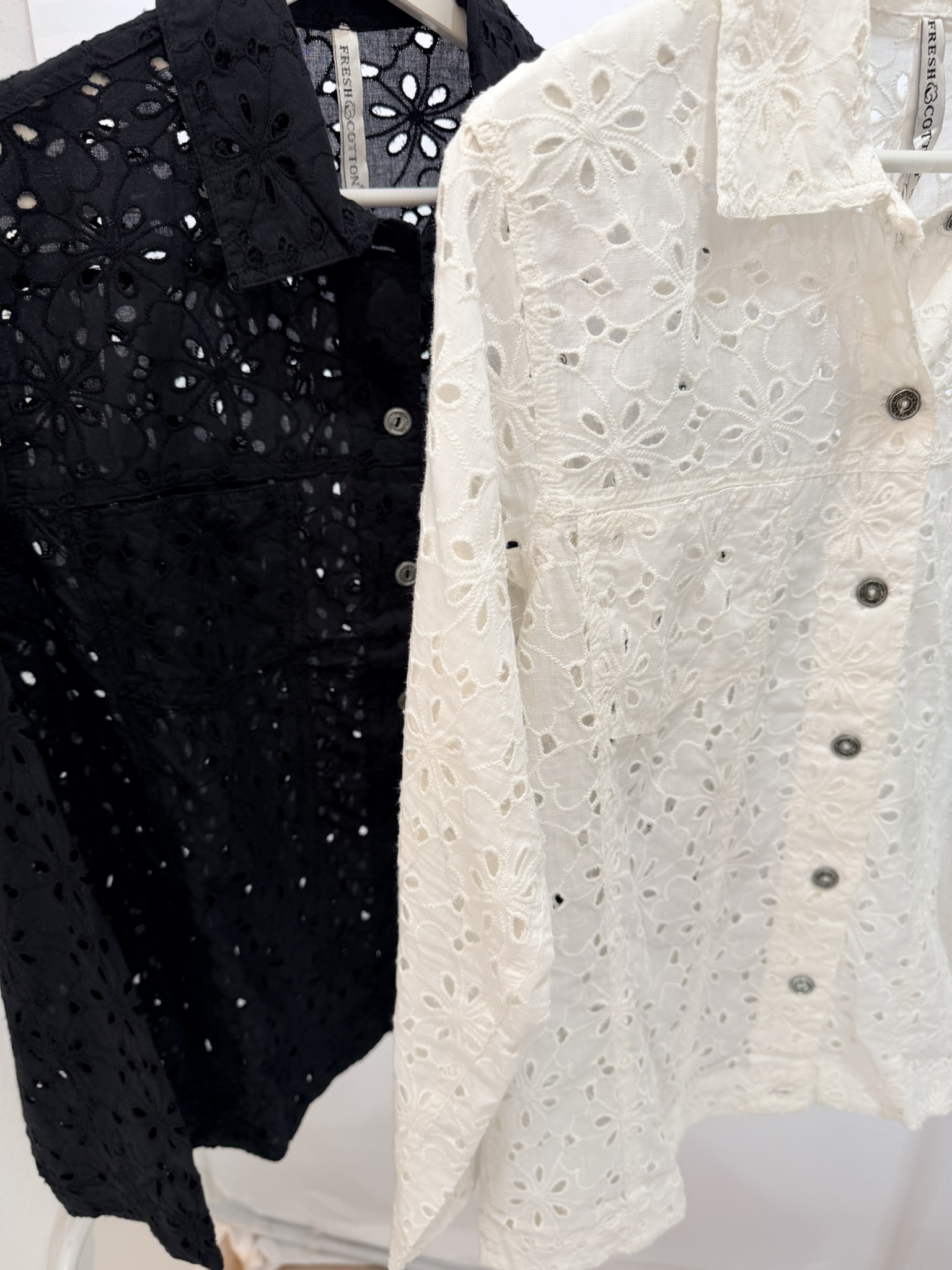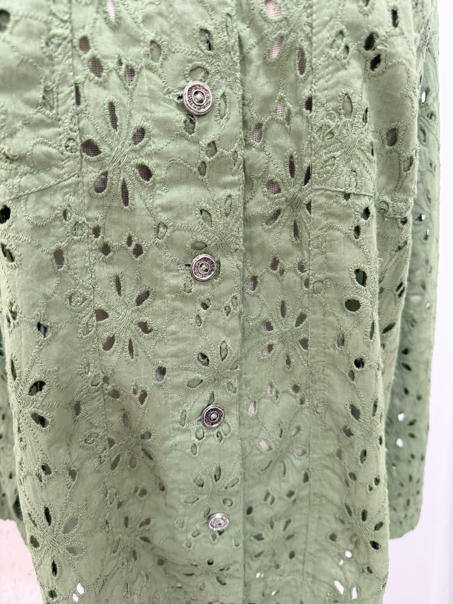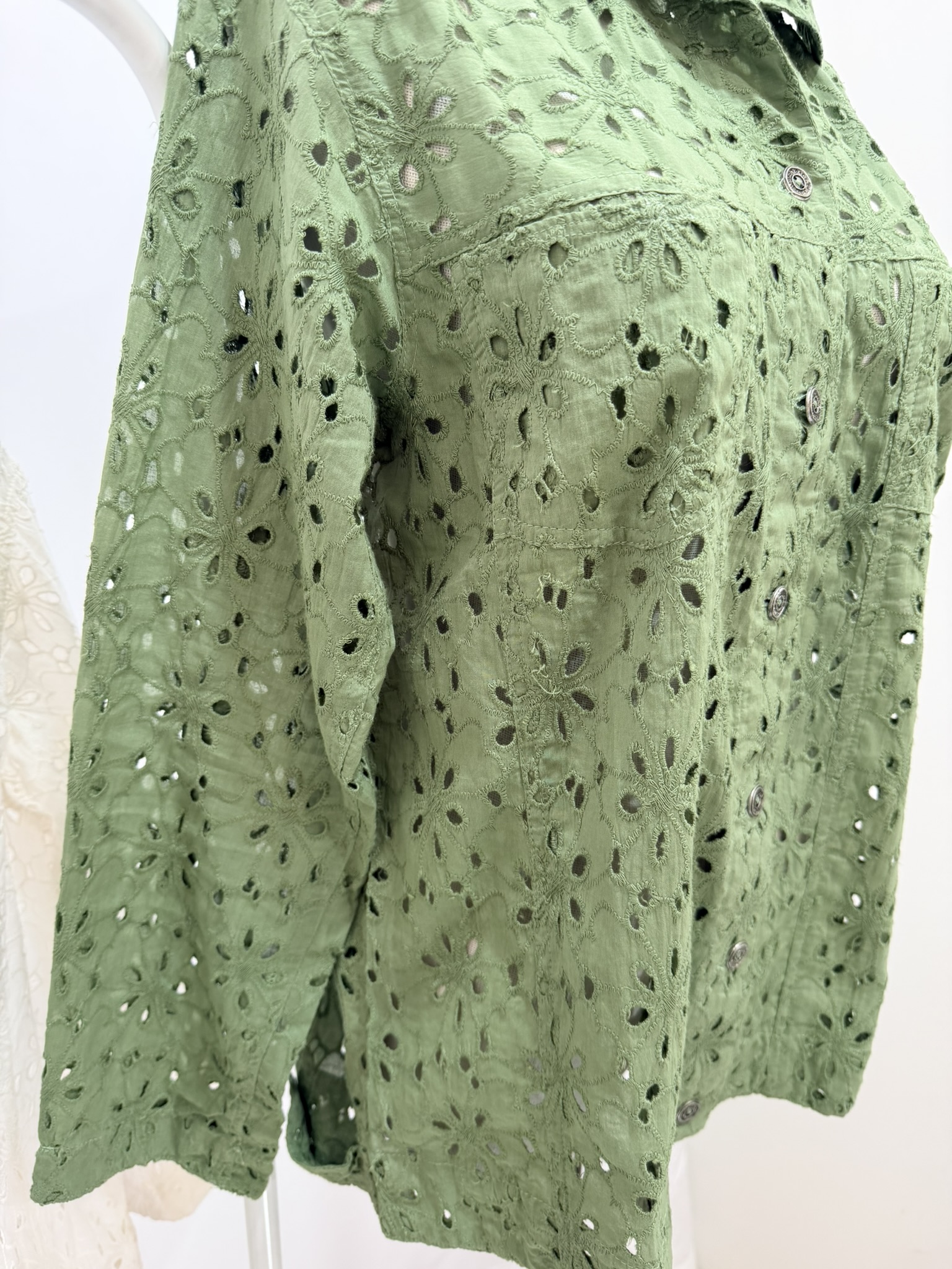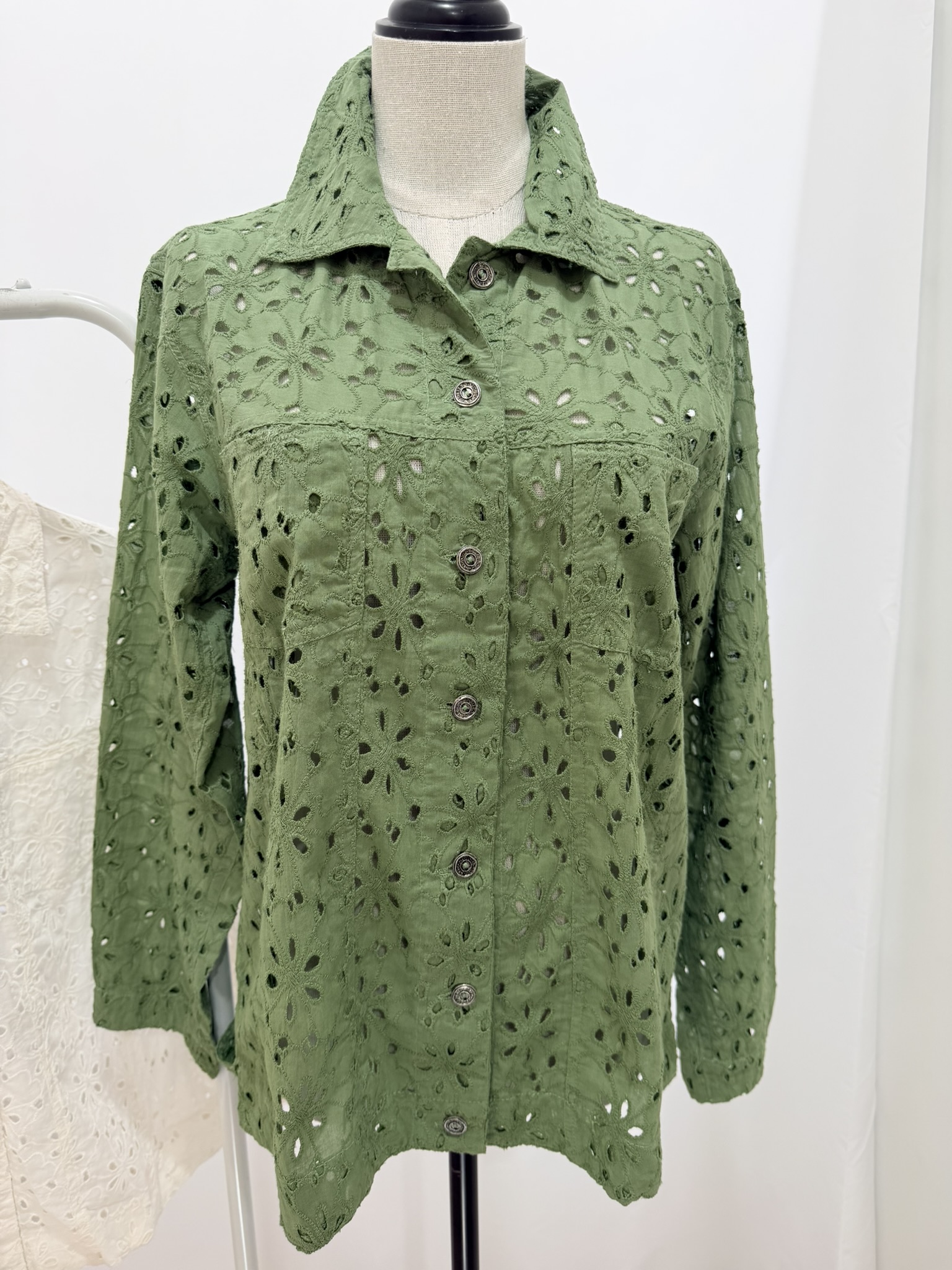 Giubbino in sangallo, il modello ricorda il giubbino classico di jeans. Vestibilità ampia