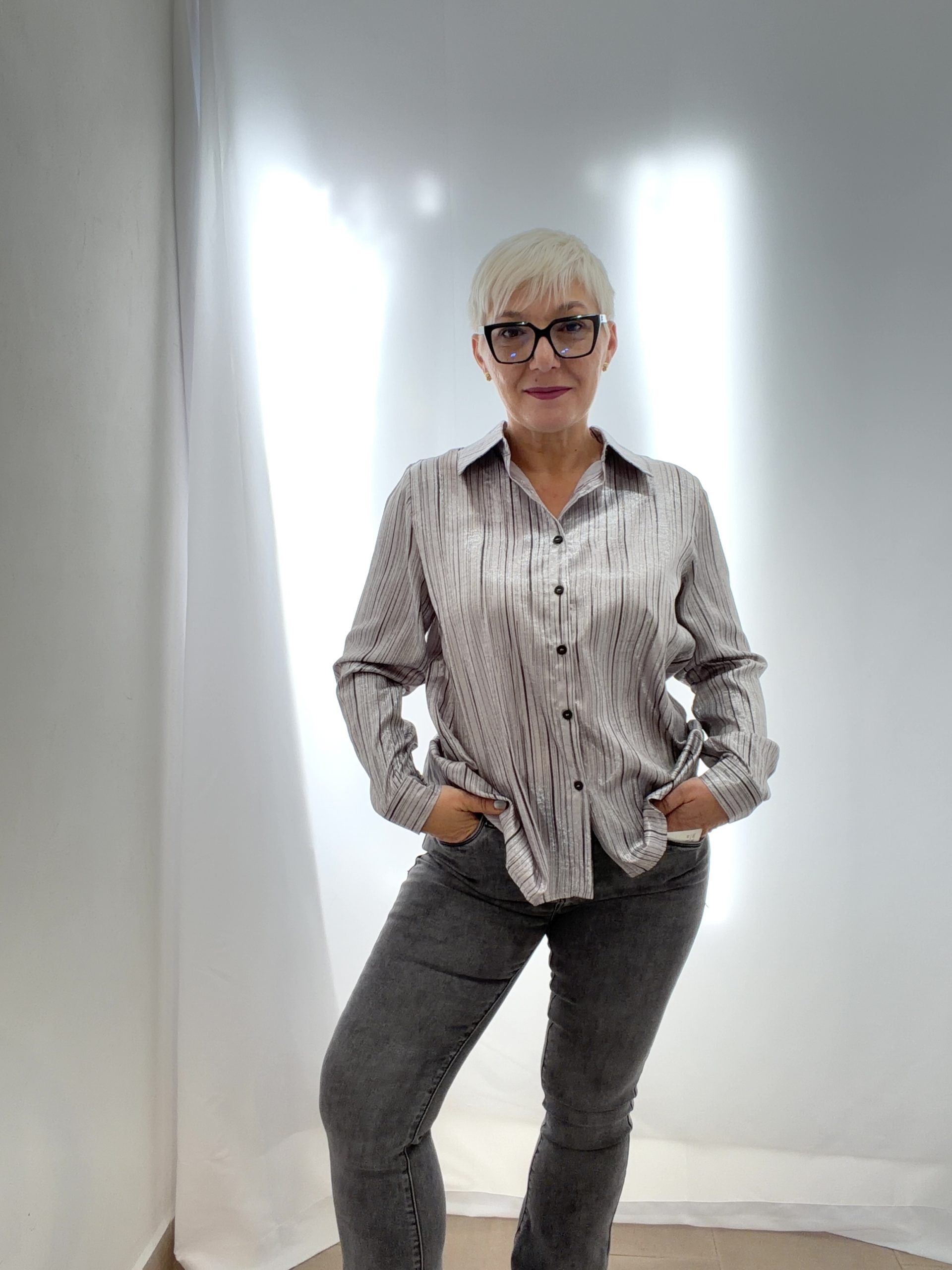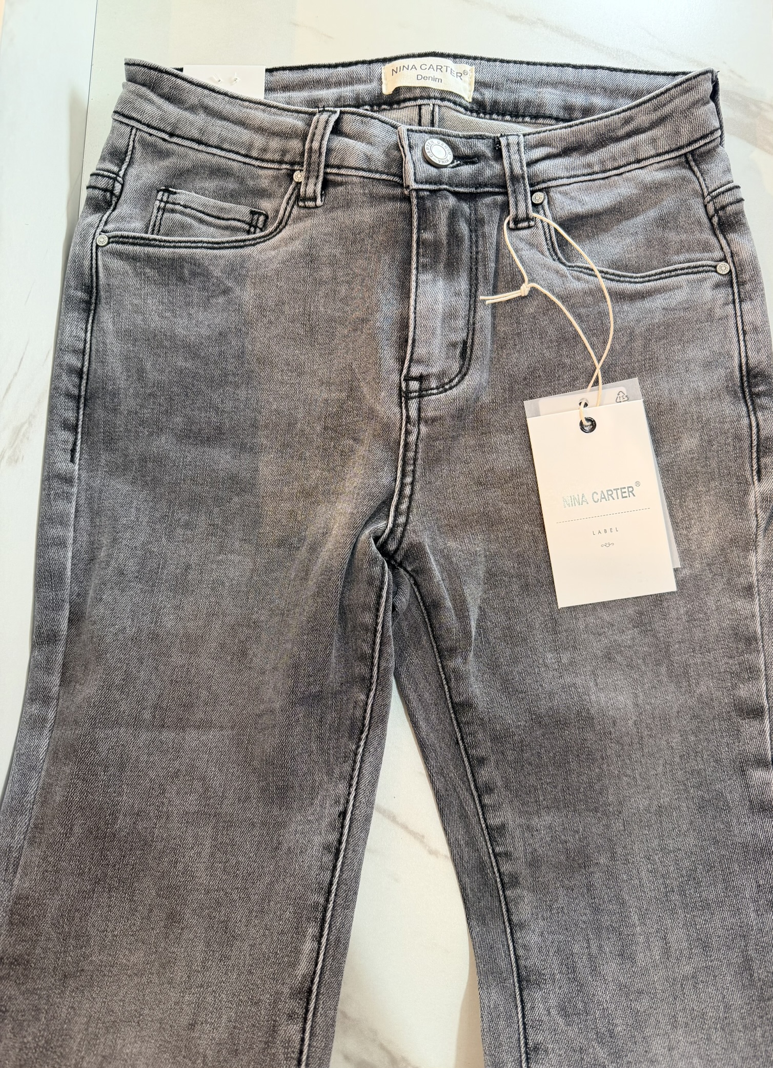 Jeans vita alta elasticizzati con zampa. Grigio