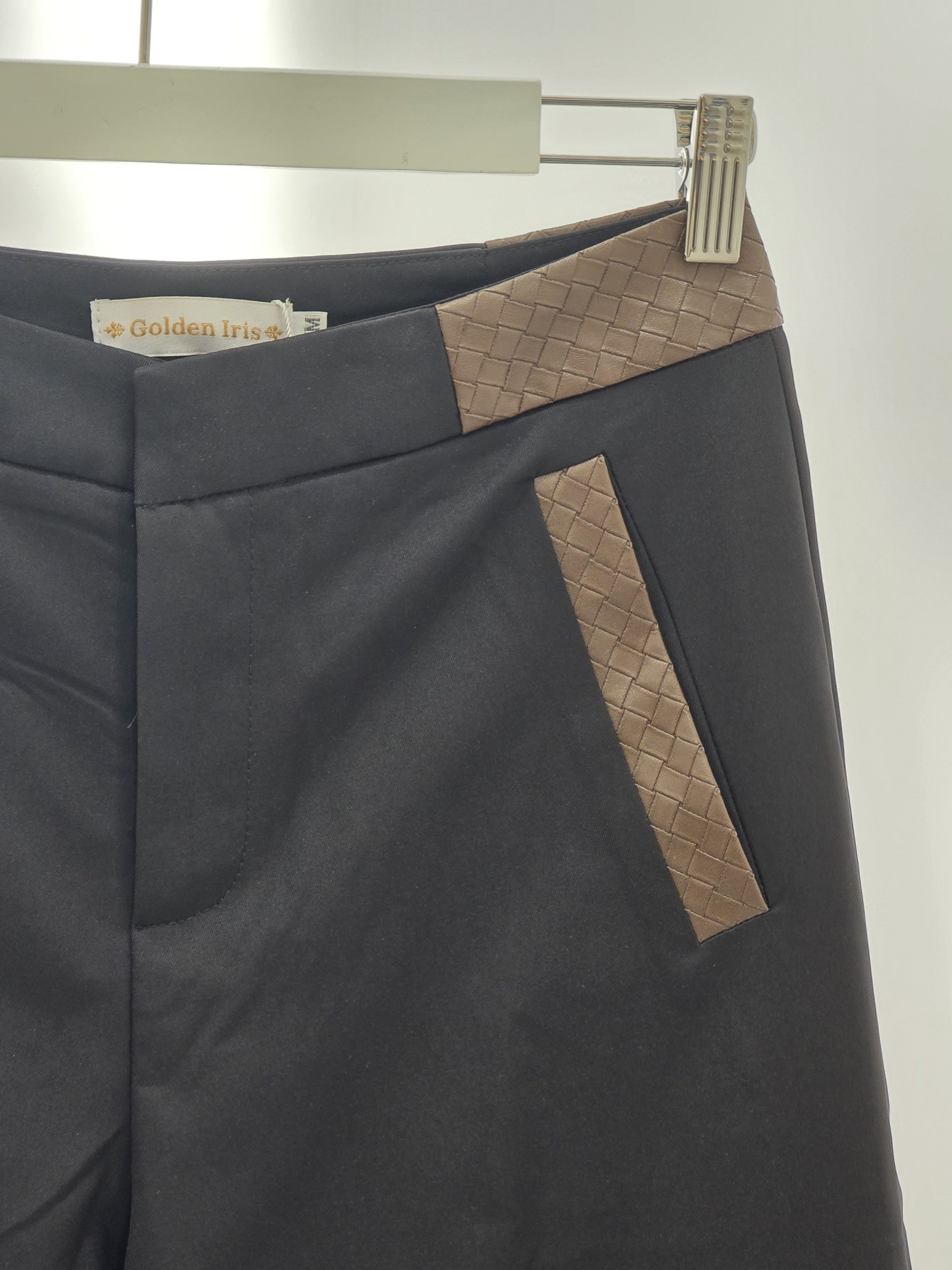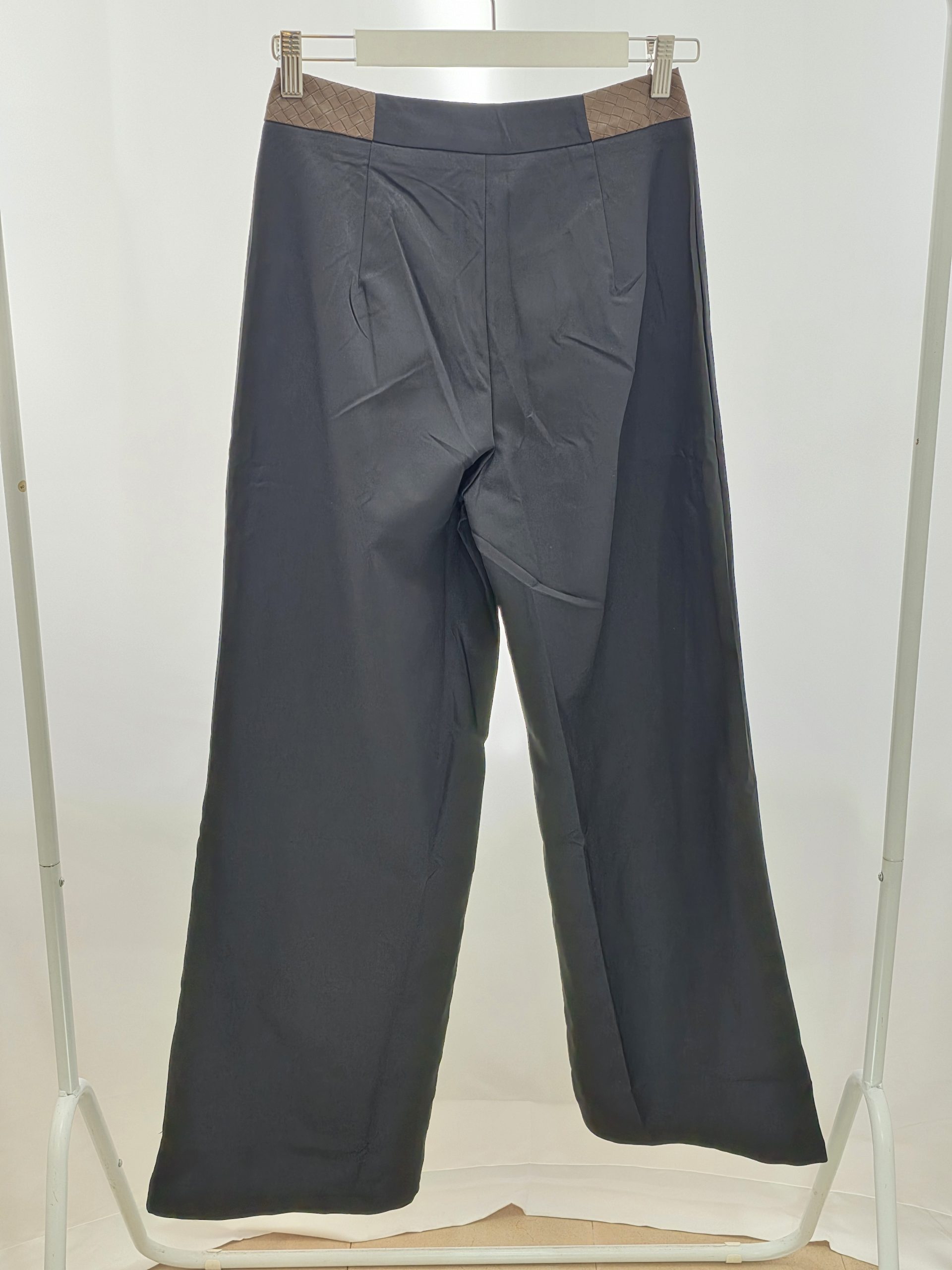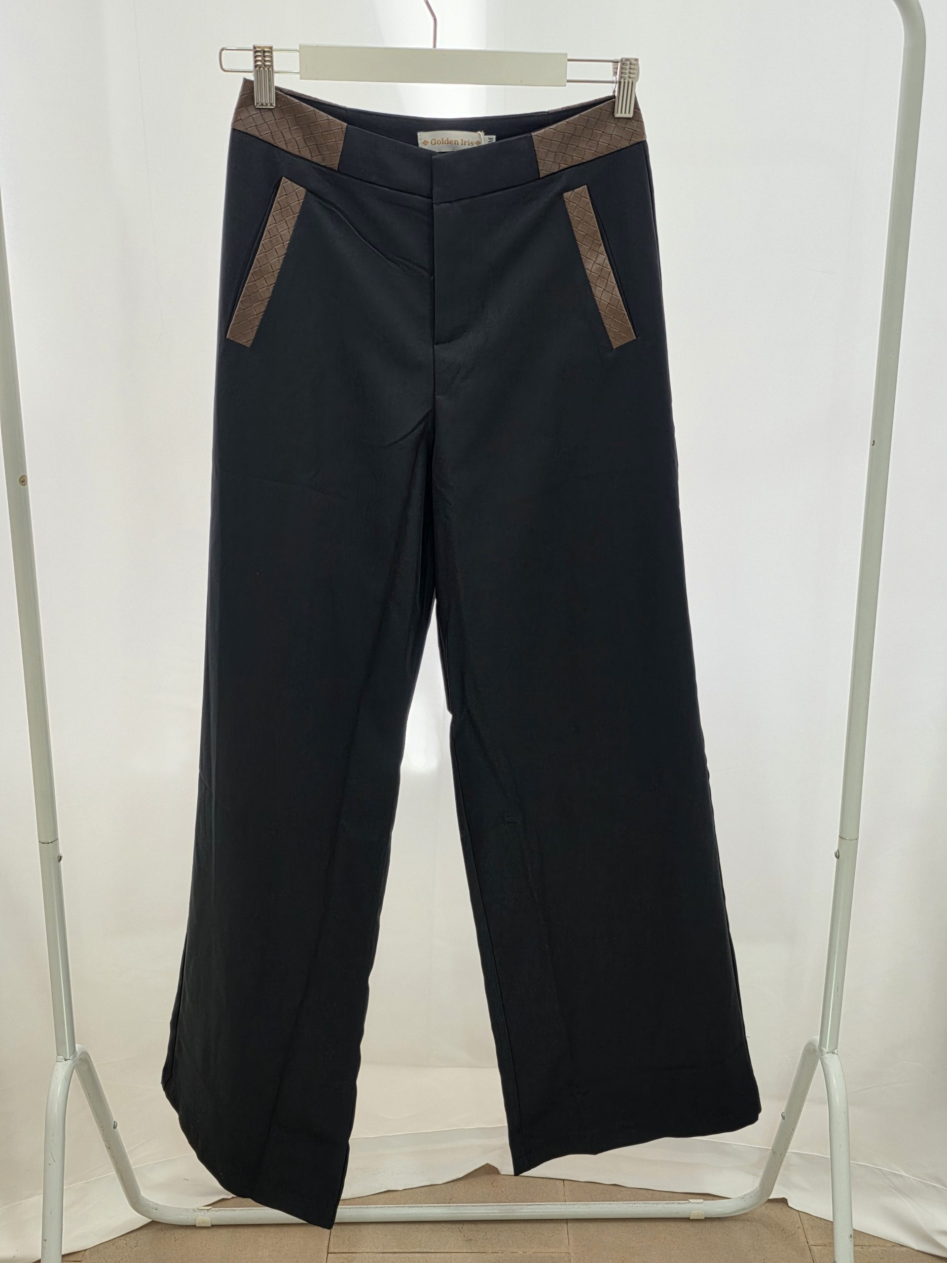 Pantalone taglio sartoriale gamba dritta, inserti in ecopelle e chiusura con bottone e cerniera. Disponibile il giubbino per un completo sportivo