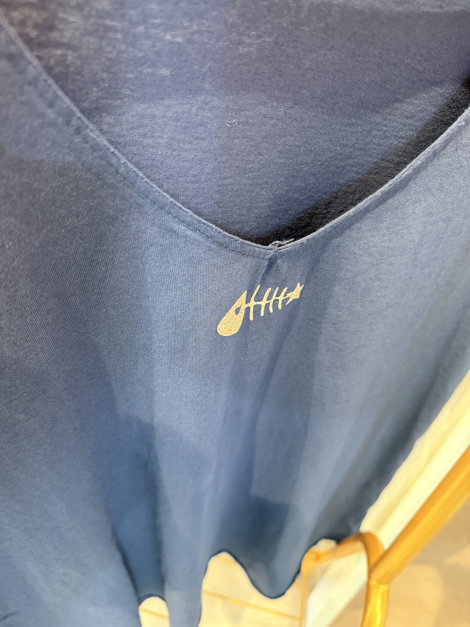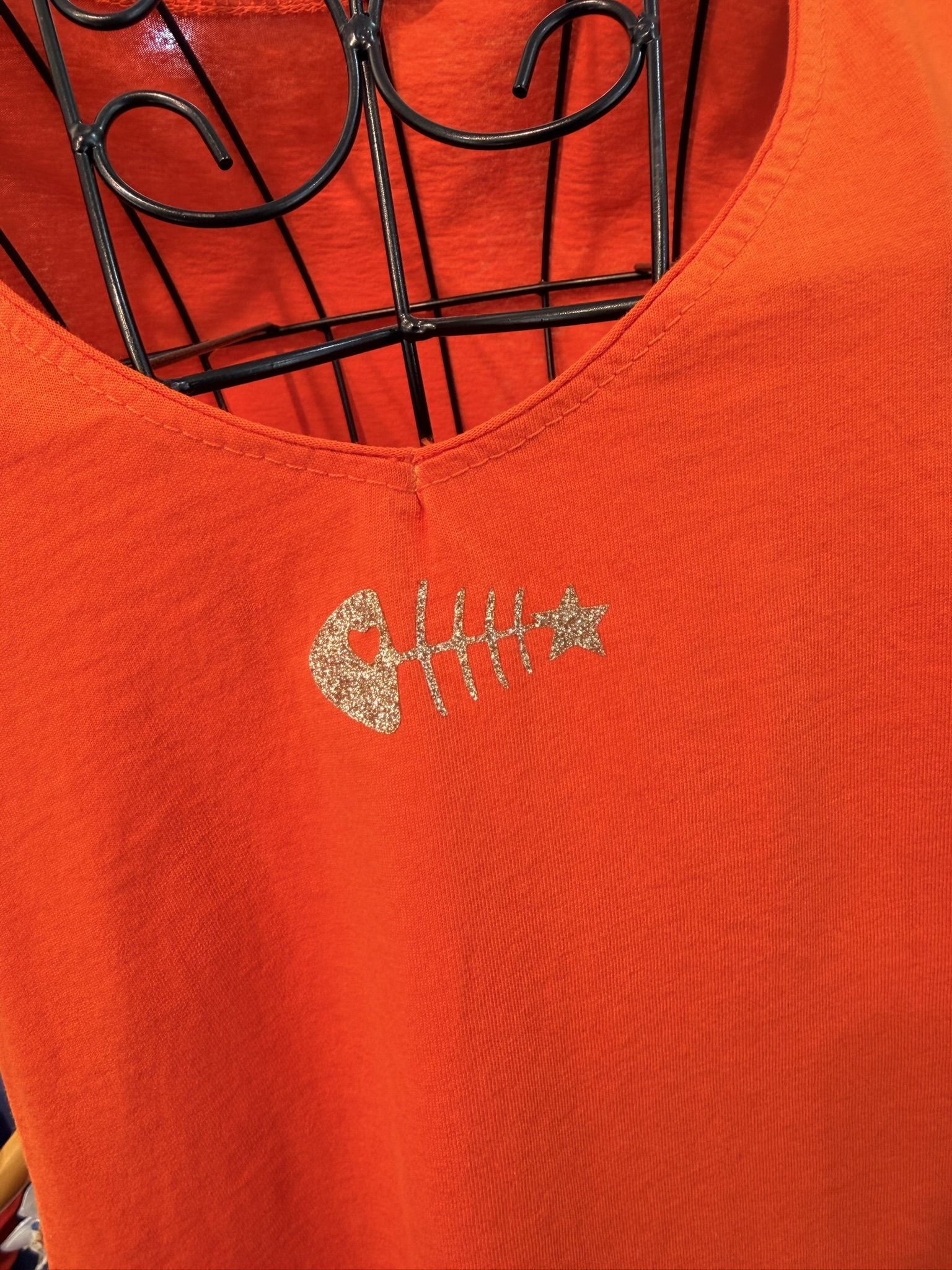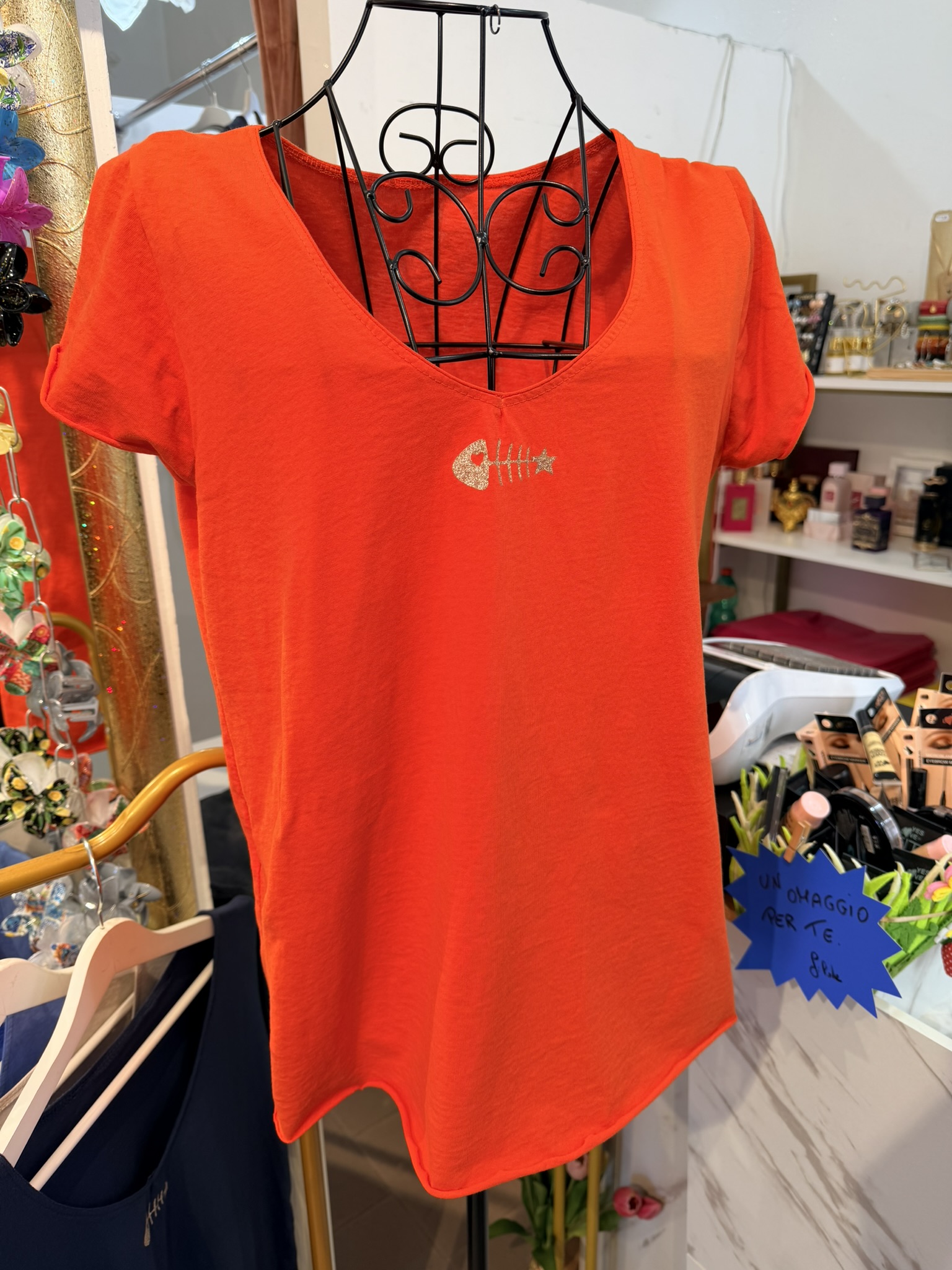 T-shirt con scollo a V in cotone con stampa di lisca pesce realizzato in paillettes. Taglia unica adatta dalla 40 alla 48