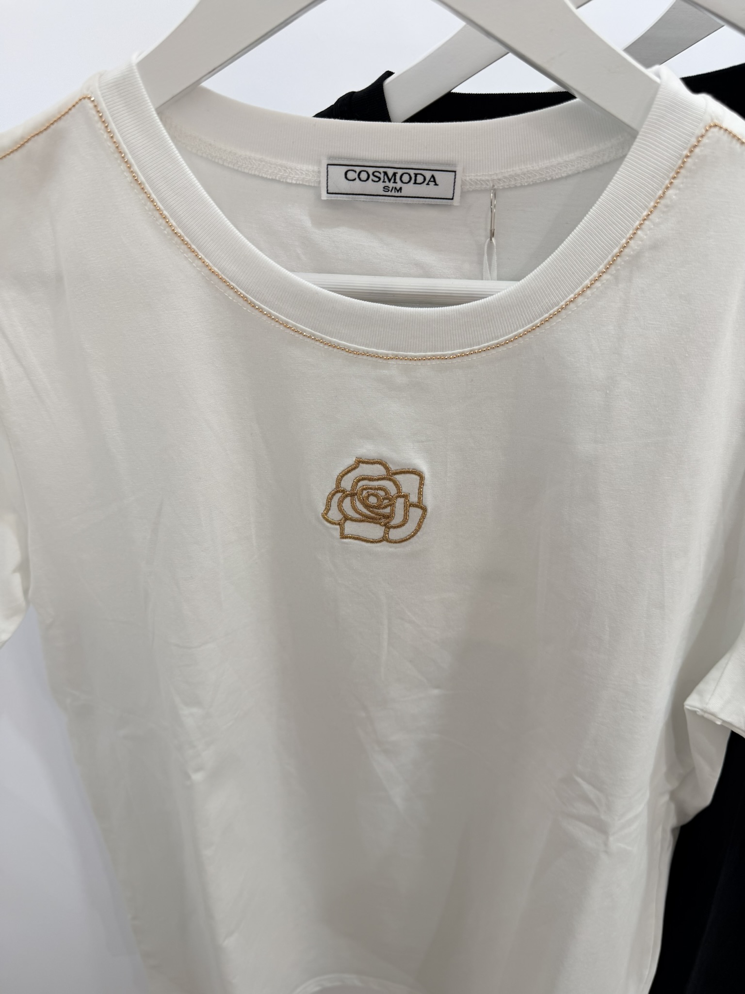 T-shirt con rosa ricamata e filo lurex , ideale da sotto giacca